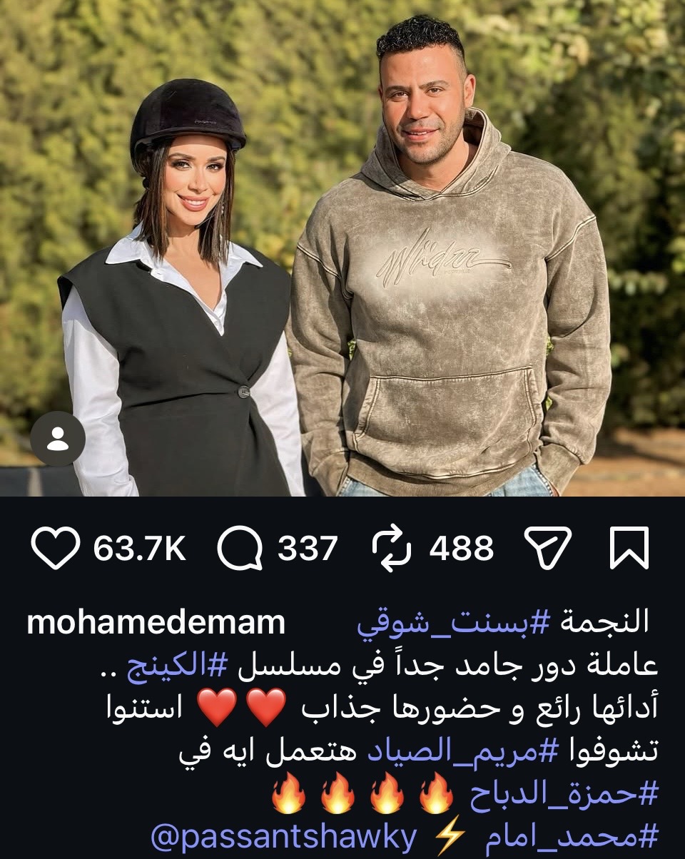 وفي هذا السياق، شارك محمد إمام جمهوره عبر حسابه الرسمي على موقع إنستجرام بصورة جمعته ببسنت شوقي من كواليس التصوير، مثنيًا على أدائها وحضورها اللافت.