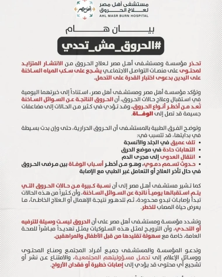 وأكدت المستشفى أن ما يجري لا يمكن اعتباره دعابة أو وسيلة للتعبير عن المشاعر، بل يمثل خطراً حقيقياً على الصحة، مشيرة إلى أن الحروق الحرارية من أخطر أنواع الحروق، حتى وإن بدت بسيطة في ظاهرها.