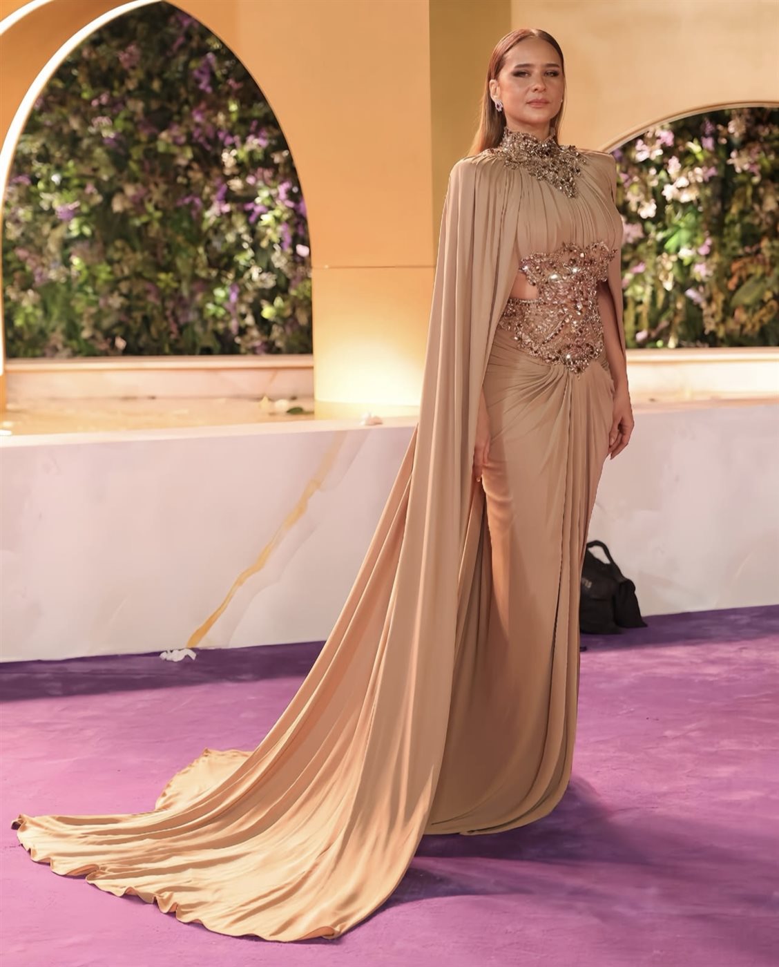 وزادت العباءة المرفقة بالفستان من فخامة الإطلالة، إذ انسدلت بخفة خلف النجمة، مانحة حضورها بعدًا دراميًا أنيقًا وإحساسًا ملكيًا لافتًا أمام عدسات المصورين. هذا التفصيل أضفى حركة وانسيابية على الإطلالة، وجعلها أكثر تأثيرًا على السجادة البنفسجية.