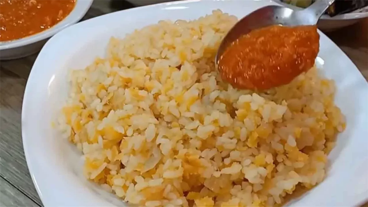 7. بعد أن ينضج الكشري، يُزين بالبصل المقلي ويُقدم ساخنًا.