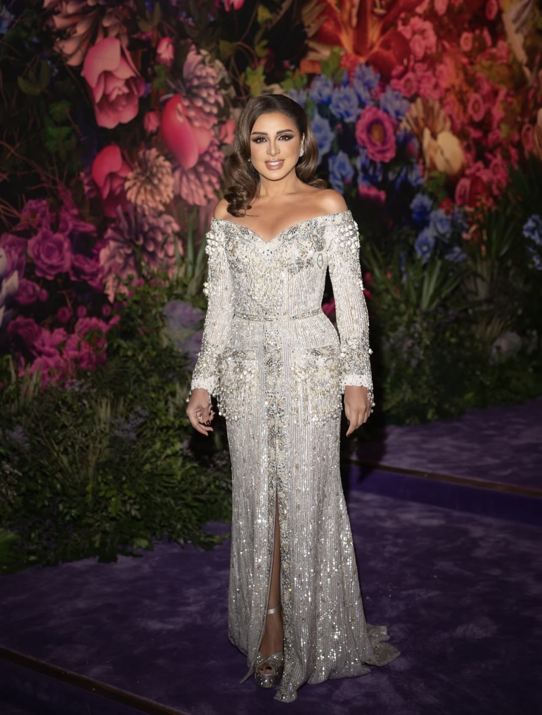 وتجلّى تميّز التصميم في التوازن الواضح بين الفخامة والنعومة، إذ حضرت التطريزات بكثافة منظمة حافظت على الخط العام للفستان ومنعته من الوقوع في فخ المبالغة. كما أضاف الشق الأمامي البسيط لمسة عصرية خفيفة منحت الإطلالة حيوية وحركة على السجادة البنفسجية.