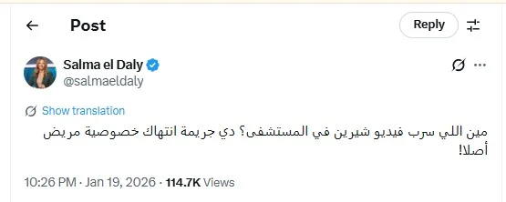 وتمتدّ القصة إلى نشر الإعلامية المصرية سلمى الدالي تدوينة استنكرت فيها ما وصفته بـ انتهاك خصوصية المريض، وتساءلت عن هوية الشخص الذي سرب هذا المحتوى من داخل المنشأة الطبية، ما زاد لدى بعض المتابعين الانطباع بأن الفيديو يعكس واقعًا حقيقيًا تعيشه الفنانة شيرين.