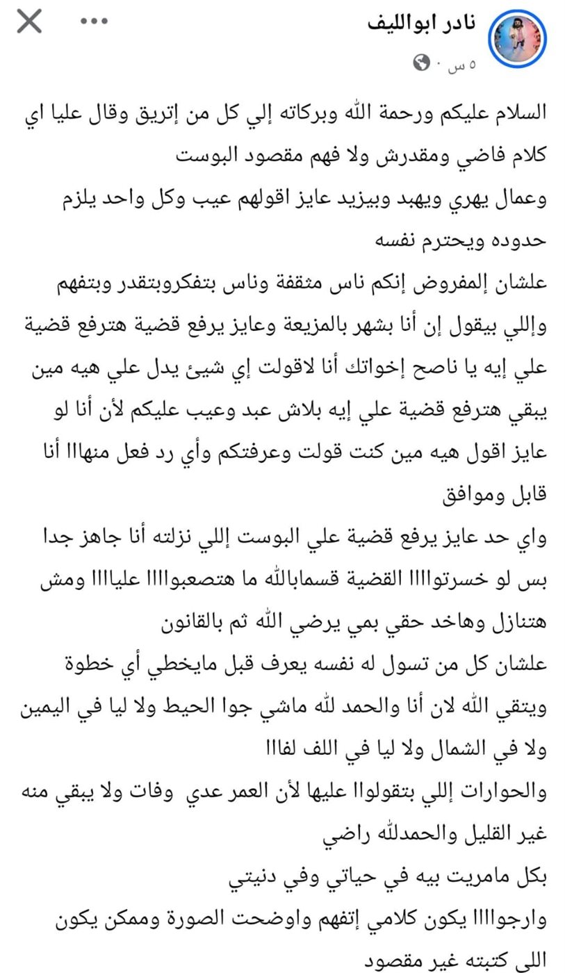 وفي ختام منشوره، أكد أبو الليف التزامه بالسير في الطريق المستقيم ورفضه الدخول في صراعات أو “حوارات” لا جدوى منها، مشددًا على رضاه الكامل عما مر به في حياته، وداعيًا المتابعين إلى تحري النية الحسنة وعدم إساءة فهم ما كُتب.