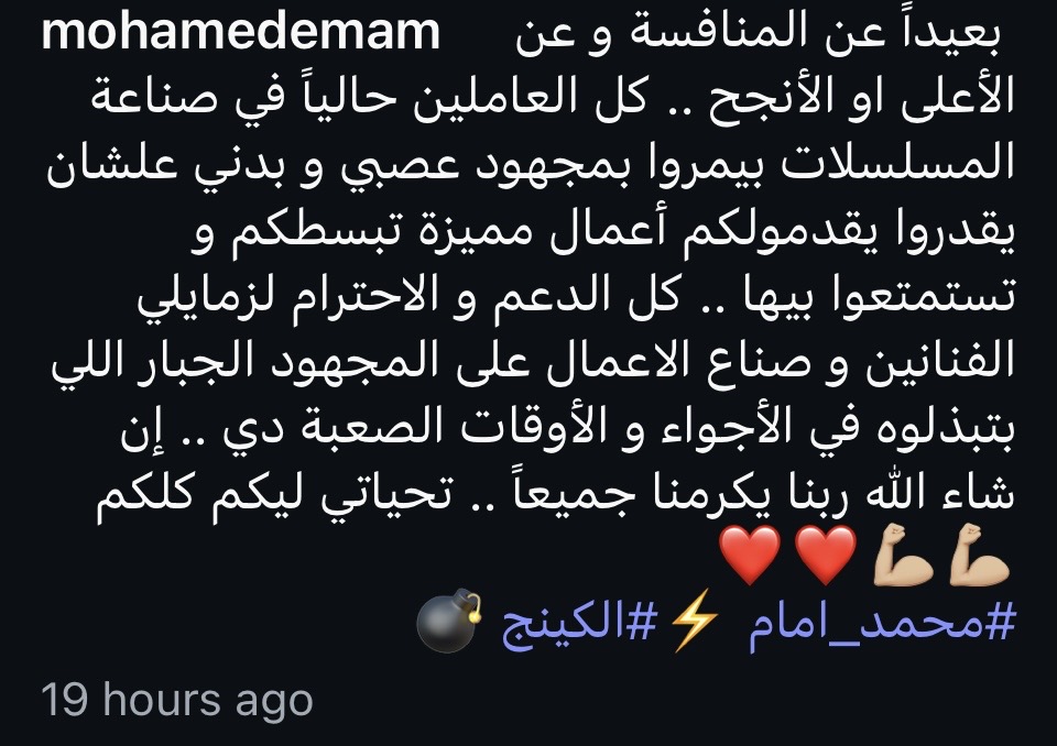وكتب محمد إمام عبر حسابه الرسمي على موقع «إنستجرام» رسالة دعم واضحة لزملائه في الوسط الفني، قال فيها: «بعيدًا عن المنافسة وعن الأعلى أو الأنجح، كل العاملين حاليًا في صناعة المسلسلات بيبذلوا مجهود عصبي وبدني علشان يقدروا يقدموا أعمال مميزة تبسطكم وتستمتعوا بيها… كل الدعم والاحترام لزمايلي الفنانين وصناع الأعمال على المجهود الجبار اللي بيبذلوه في الأجواء والأوقات الصعبة دي، إن شاء الله ربنا يكرمنا جميعًا».
