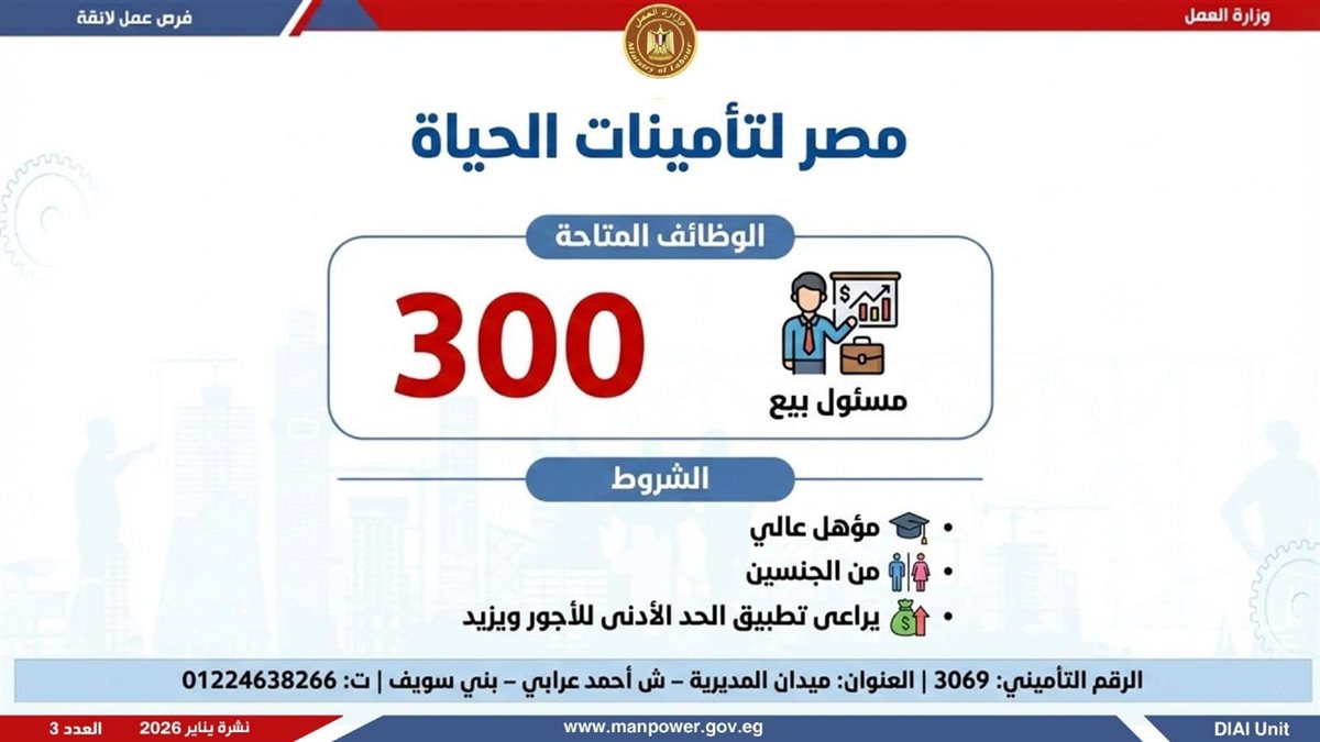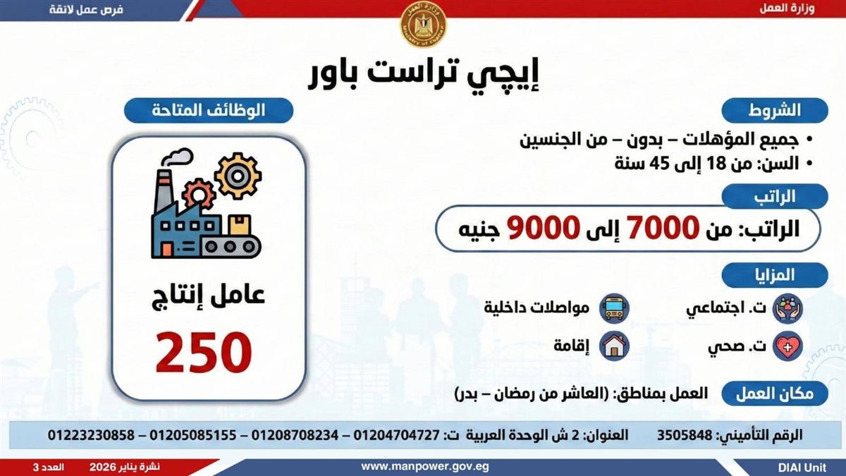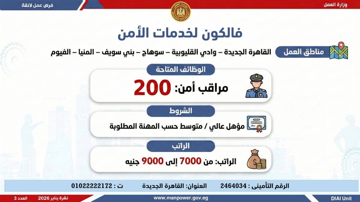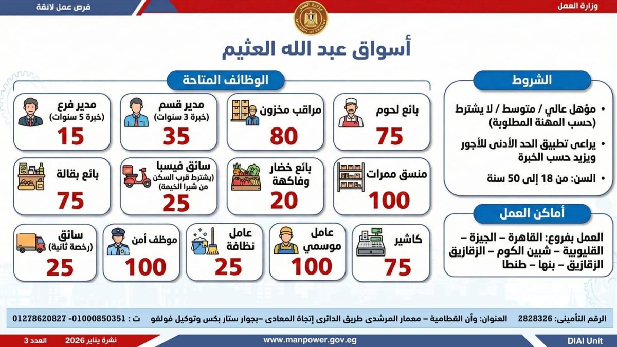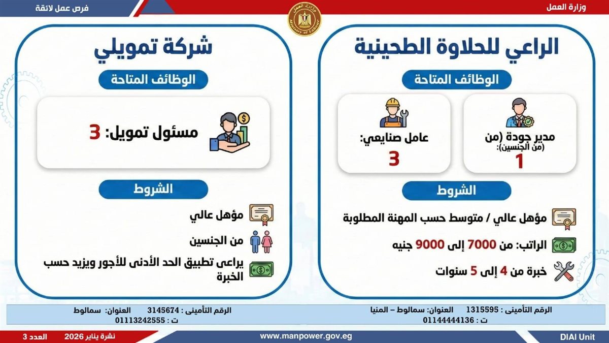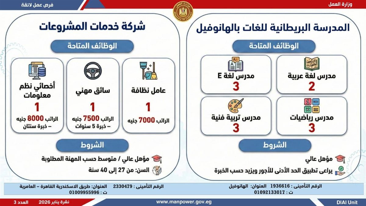 في إطار التزام الدولة بمواجهة البطالة، ودعم جهود التشغيل، وتعزيز الشراكة مع القطاع الخاص، أعلن وزير العمل محمد جبران، اليوم الثلاثاء، عن إصدار نشرة التوظيف نصف الشهرية، والتي تتضمن توفير 4379 فرصة عمل جديدة بالتعاون مع 37 شركة من شركات القطاع الخاص، موزعة على 12 محافظة، مع إتاحة التقديم خلال شهر فبراير 2026.