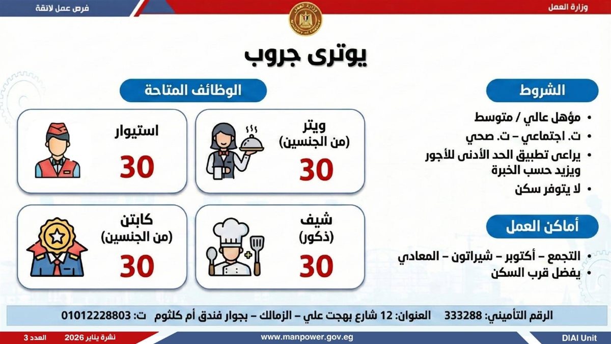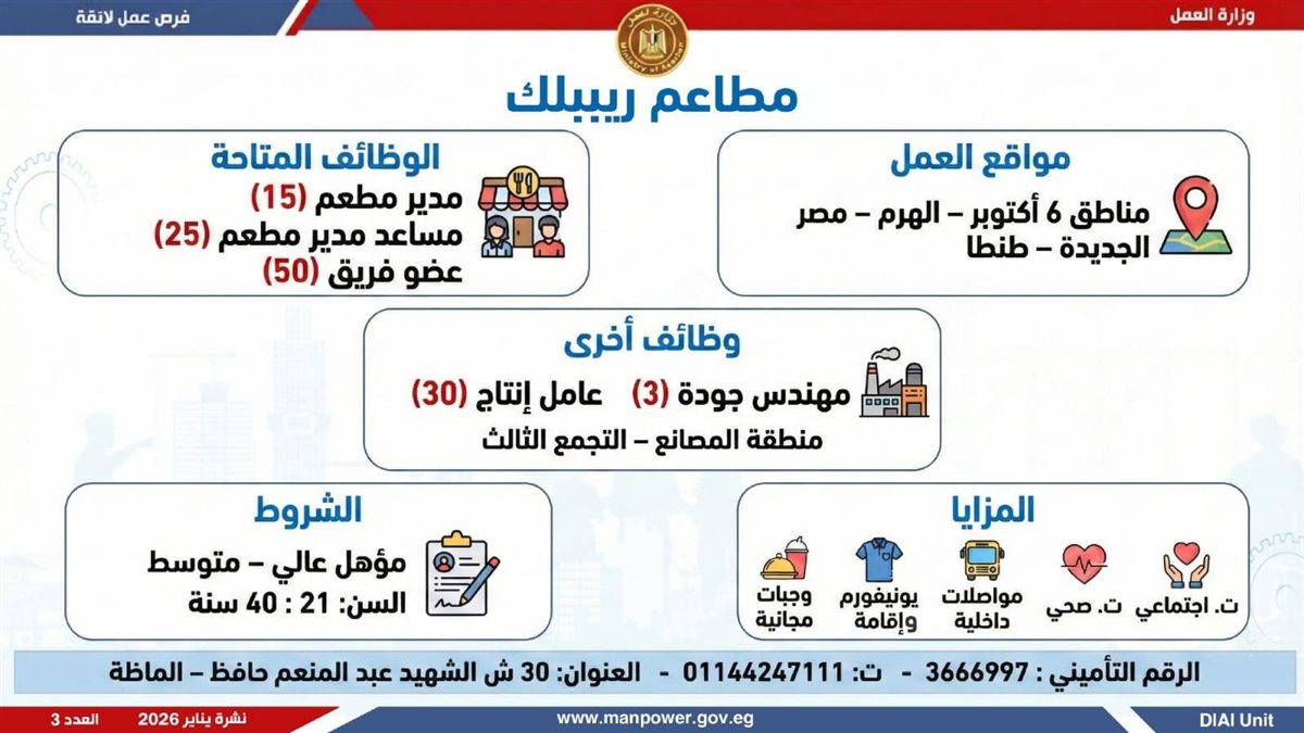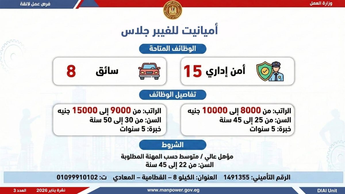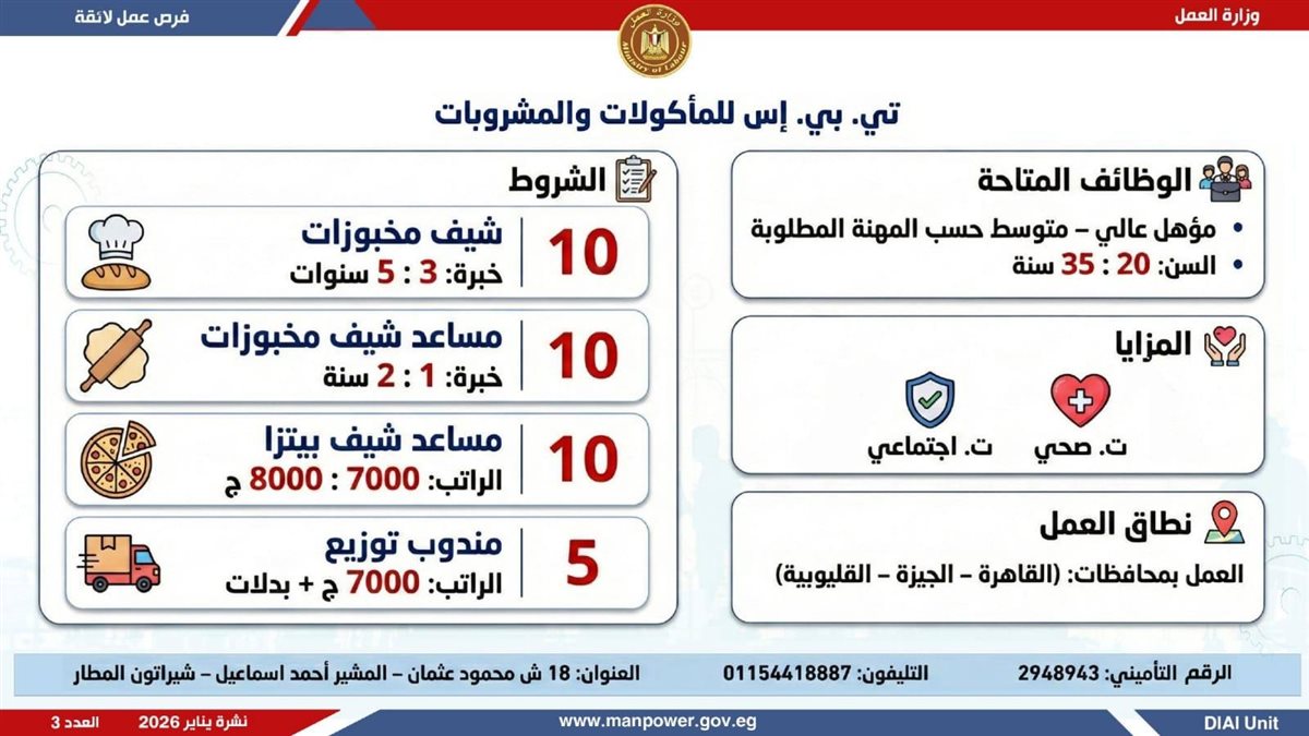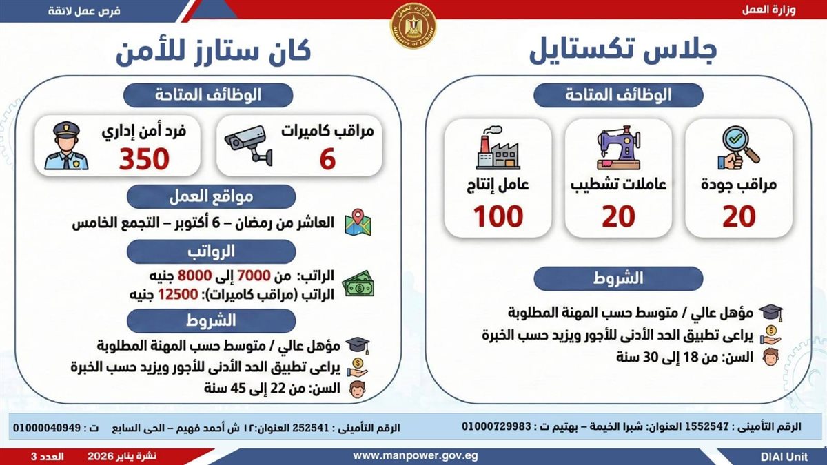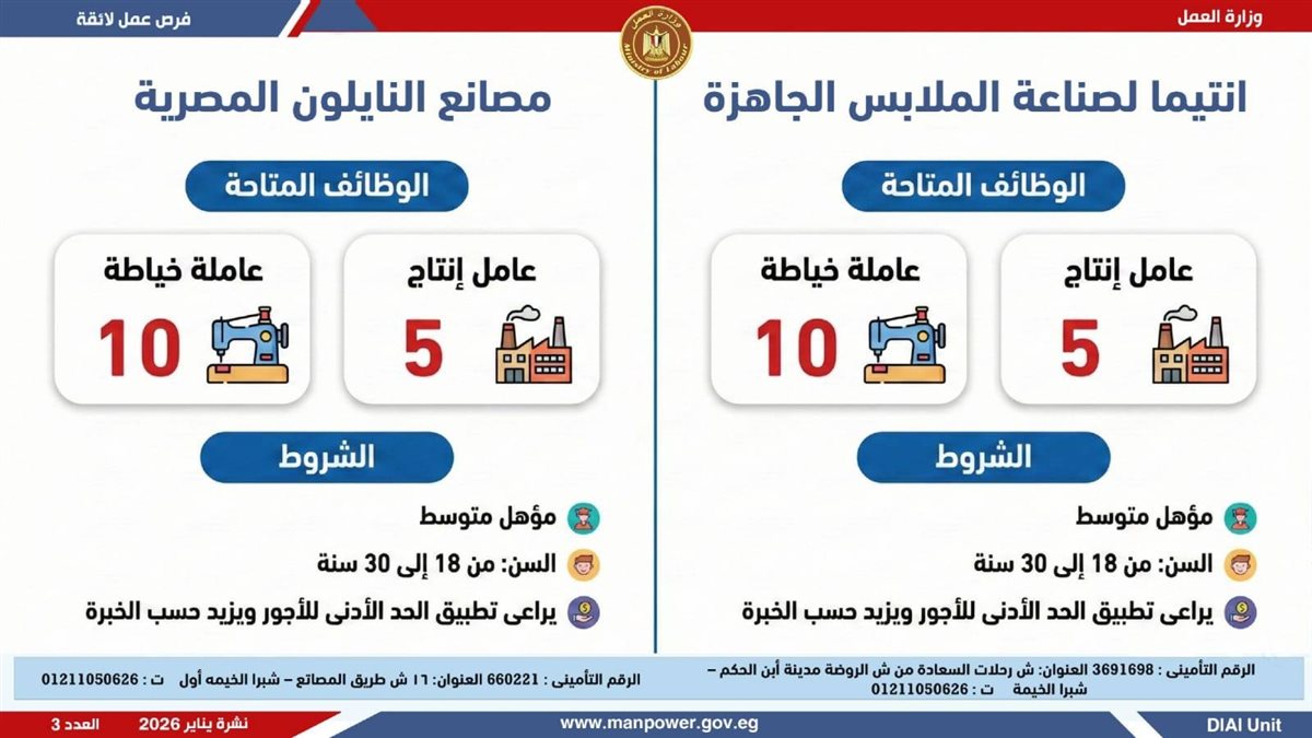 وأوضحت وزارة العمل، في بيان لها ، أن الفرص المتاحة تشمل وظائف متنوعة في عدد من التخصصات والمهن، من بينها فرص مخصصة لذوي الهمم، برواتب مجزية تُحدد وفقًا لطبيعة الوظيفة والمقابلة الشخصية، مع الالتزام الكامل بتطبيق الحد الأدنى للأجور، إلى جانب الاستفادة من مظلة التأمينات الاجتماعية والصحية.