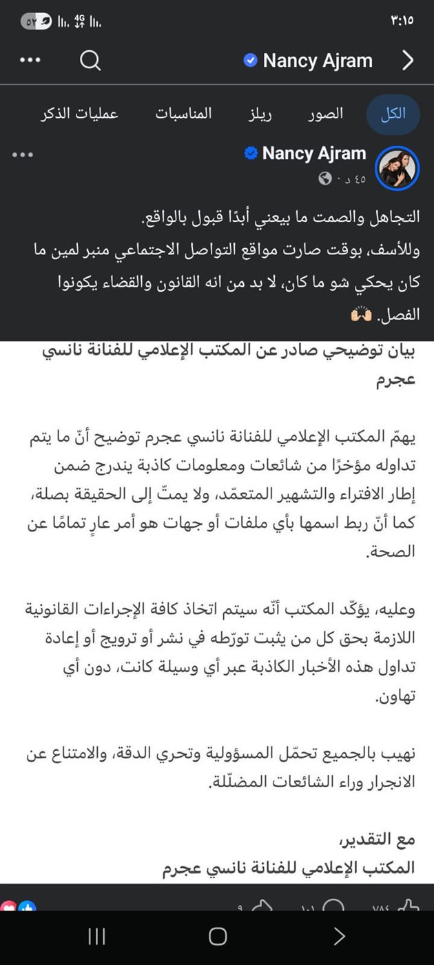 أصدر المكتب الإعلامي للفنانة نانسي عجرم بيانًا توضيحيًا حاسمًا، نفى فيه بشكل قاطع جميع الشائعات والمعلومات المغلوطة التي تم تداولها مؤخرًا بشأنها، خاصة ما تردد حول ربط اسمها بقضايا تتعلق بما يُعرف بـ«جزيرة إبستين».