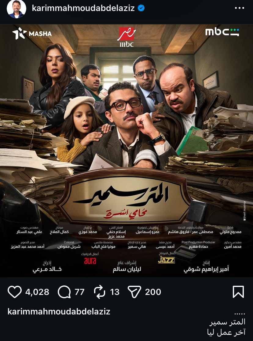 أثار الفنان كريم محمود عبد العزيز موجة واسعة من الجدل والتساؤلات، بعد نشره البوستر الرسمي لمسلسله الجديد المتر سمير عبر حسابه على موقع إنستجرام، مرفقًا إياه بتعليق صادم قال فيه: «المتر سمير آخر عمل ليا»، وهو ما فتح الباب أمام تكهنات عديدة حول احتمالية اعتزاله الدراما التلفزيونية.