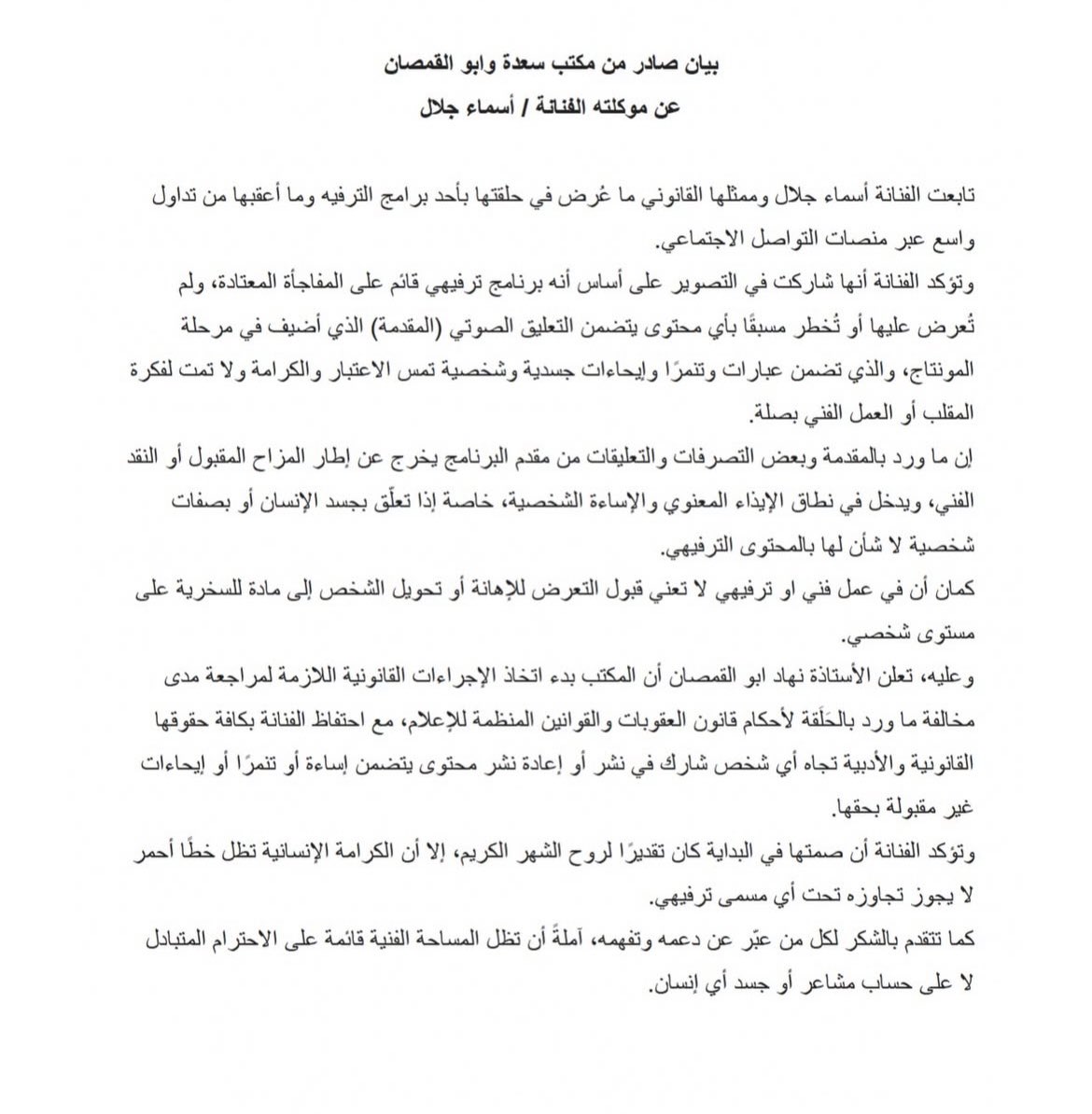 وبحسب المصادر ذاتها، قررت الفنانة اتخاذ الإجراءات القانونية اللازمة ضد ما ورد في المقدمة، تأكيدًا على حقها في الدفاع عن كرامتها، ورفضًا لتطبيع السخرية الجارحة تحت غطاء الكوميديا، في خطوة لاقت دعمًا كبيرًا من عدد من زملائها في الوسط الفني.