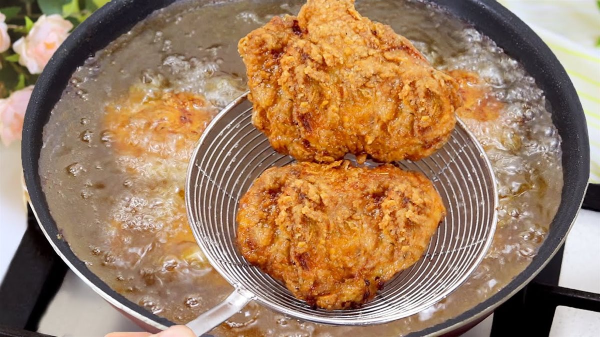 تخرج قطع الدجاج وتترك جانبًا.يوضع الدجاج في الثلاجة دون أن يغطى لمدة نصف ساعة.يقلي في الزيت على نار متوسطة هادئة حتي تمام النضج.