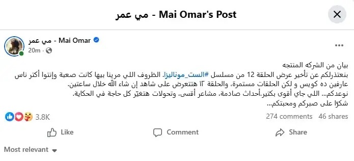 خرجت مي عمر لتقديم اعتذار رسمي لجمهورها عبر صفحتها على فيسبوك، مؤكدة تفهمها لتساؤلات المشاهدين حول سبب عدم عرض الحلقة على منصة شاهد الرقمية. وذكرت في بيانها: “بيان من الشركة المنتجة، بنعتذر لكم عن تأخير عرض الحلقة 12 من مسلسل الست موناليزا، الظروف اللي مرّينا بيها كانت صعبة، وإنتوا أكتر ناس عارفين ده كويس، ولكن الحلقات مستمرة.”