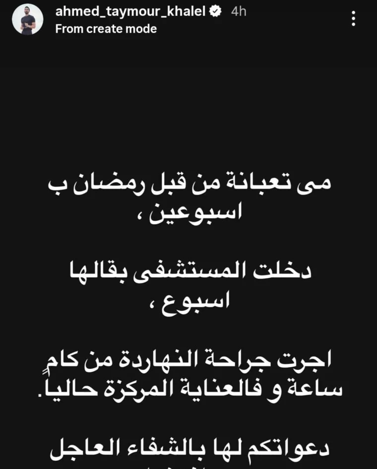 وأوضح أحمد تيمور، في منشور عبر حسابه على “إنستغرام”، أن بداية الأزمة تعود إلى نحو أسبوعين قبل شهر رمضان، حين شعرت مي بإعياء شديد استلزم دخولها المستشفى للمرة الأولى. ومع تطور الأعراض بشكل مفاجئ، خضعت لجراحة منذ ساعات قليلة، وتخضع حاليًا لمتابعة دقيقة داخل العناية المركزة، مطالبًا جمهورها بالدعاء لها بالشفاء العاجل.