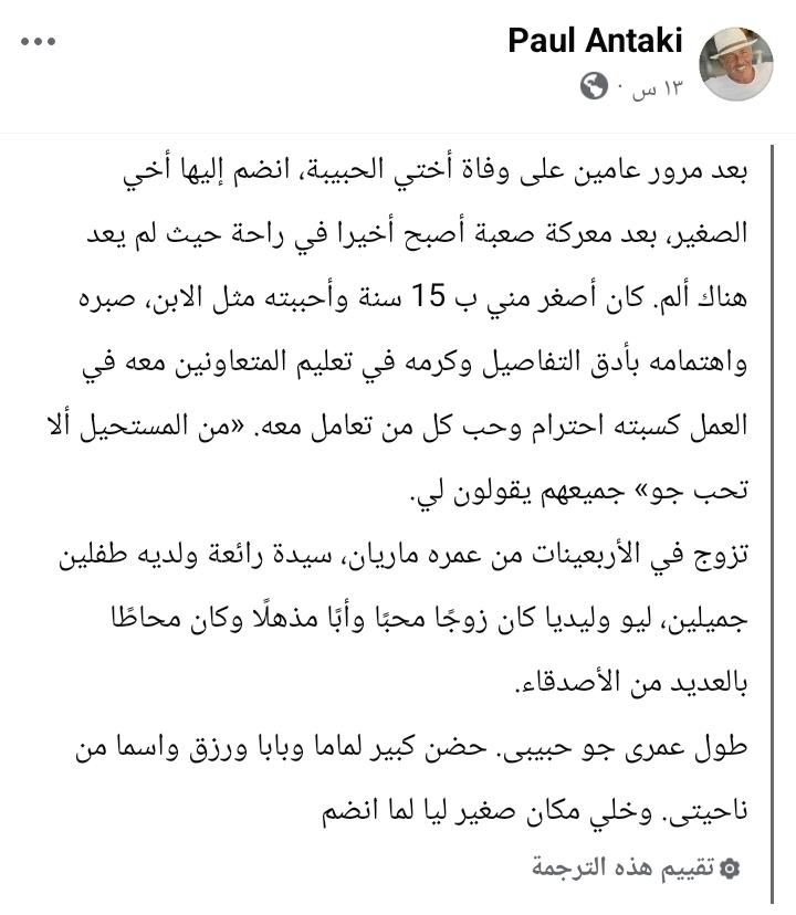 وأعلن شقيق الراحل، بول أنطاكي، نبأ الوفاة عبر حسابه الرسمي على موقع “فيسبوك”، حيث كتب: “ببالغ الحزن والأسى، ننعى إليكم وفاة فقيدنا جو”، موضحًا أن مراسم الجنازة ستُقام في كنيسة القديس كيرلس بمنطقة كوربا – هليوبوليس، يوم الخميس الموافق 5 مارس.