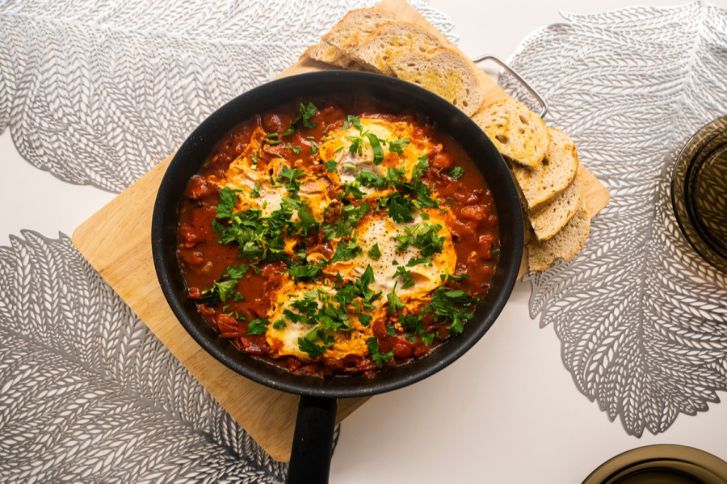 يكسر البيض في أماكن متفرقة من الشكشوكة، ثم تخفض النار ويغطى ويترك لينضج على حرارة هادئة او بالفرن لو امكن.