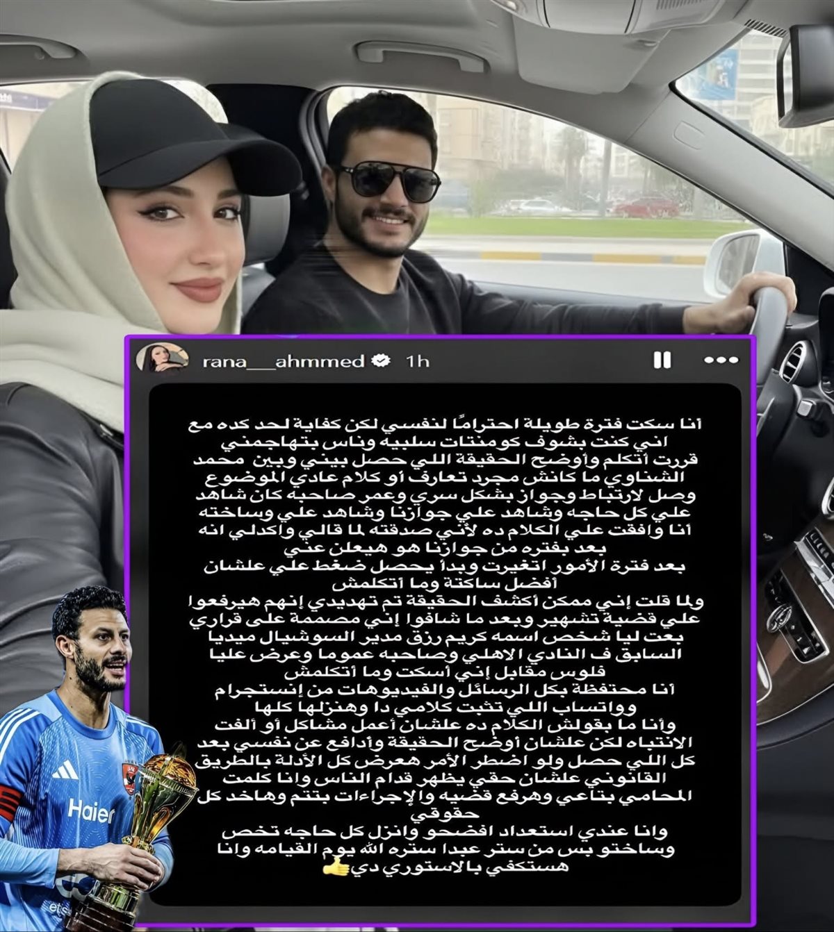 ولم يتوقف الأمر عند ادعاء الزواج، بل اتهمت رنا أحمد أطرافاً محسوبة على الحارس بمحاولة تهديدها بمقاضاتها بتهمة "التشهير" حال كشفها للحقيقة. كما زعمت في منشورها أنه تم التواصل معها عبر وسطاء لعرض مبالغ مالية مقابل إغلاق الملف والسكوت التام، وهو ما رفضته قائلة: "أنا لا أبحث عن الشهرة أو لفت الانتباه، أنا أدافع عن نفسي بعد كل ما حدث."