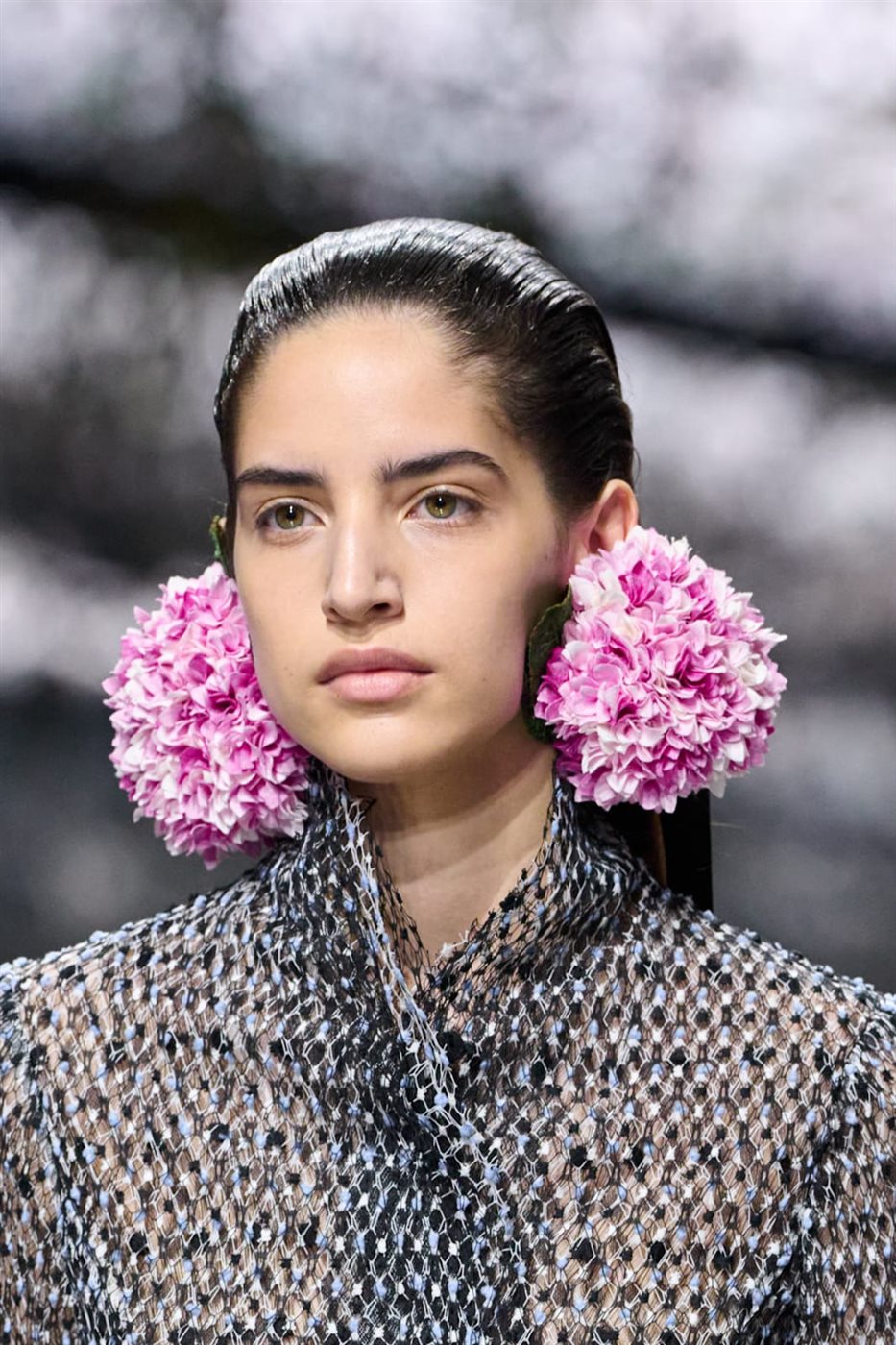 فقد تم إبراز الخدين ببلاشر وردي مشمشي واضح يمنح البشرة مظهرا صحيا ومشرقا، وهو من الألوان الرائجة في مكياج الربيع على منصات أسابيع الموضة.