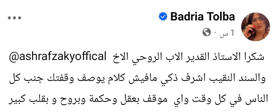 نشرت بدرية طلبة عبر حسابها الشخصي على Facebook منشورًا عبّرت فيه عن امتنانها لموقف نقيب الممثلين أشرف زكي، قائلة: “شكرًا الأستاذ القدير الأب الروحي الأخ والسند النقيب أشرف زكي .. مافيش كلام يوصف وقفتك جنب كل الناس في كل وقت .. وأي موقف بعقل وحكمة وبروح وبقلب كبير”.