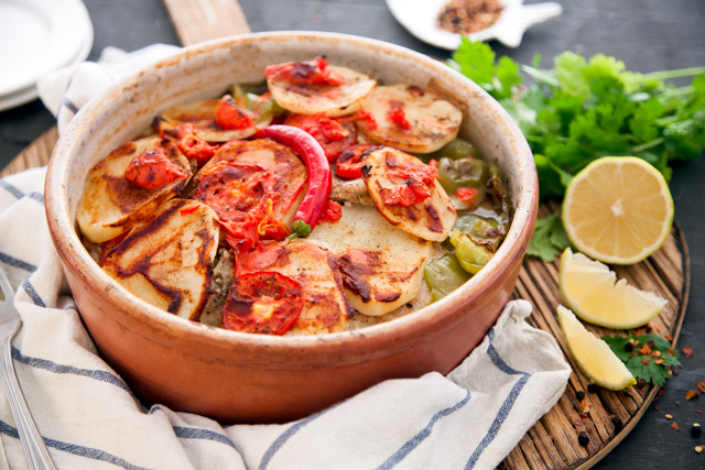 6) ضعي الصينية في الفرن المُسخَّن على درجة حرارة 180 درجة مئوية لمدة 40-45 دقيقة، أو حتى تنضج البطاطس وينضج السمك تمامًا.