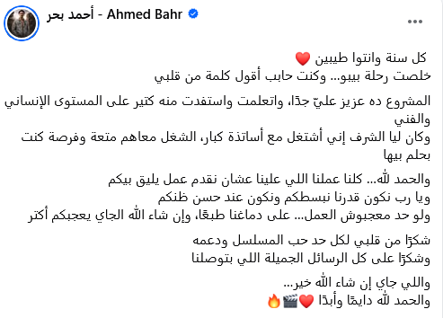 وفي رسالة مطوّلة عبر حسابه الرسمي على فيسبوك، كتب كزبرة: “كل سنة وأنتوا طيبين، خلصت رحلة بيبو، وكنت حابب أقول كلمة من قلبي. المشروع ده عزيز عليّ جدًا، واتعلمت واستفدت منه كتير على المستوى الإنساني والفني، وكان ليا الشرف إني أشتغل مع أساتذة كبار، الشغل معاهم متعة وفرصة كنت بحلم بيها.”