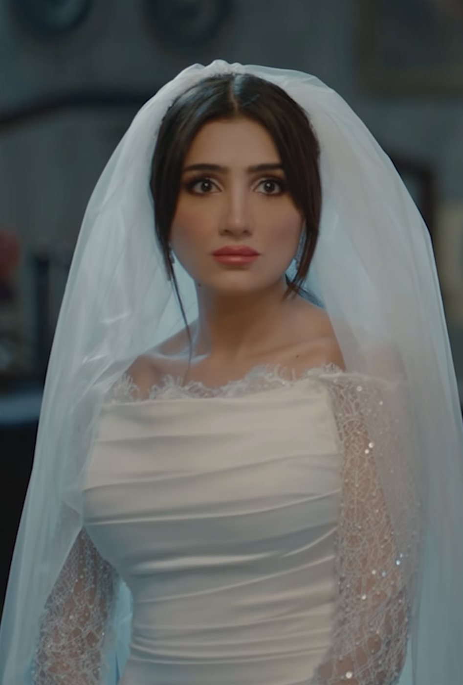 برزت إحدى أهم الإطلالات في مشهد ارتدت فيه مي عمر فستان زفاف أبيض، بتصميم ناعم وقصة كلاسيكية. جاء الفستان مزودًا بتفاصيل درابيه عند الصدر وتصميم أوف شولدر، ما أضفى على المظهر لمسة من الرقي والبساطة، متماشيًا مع سياق العمل الدرامي وإبراز الأناقة الكلاسيكية للشخصية.