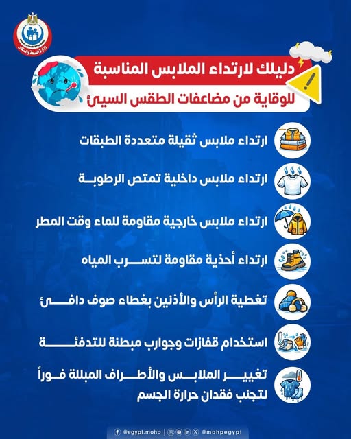 وأكدت الوزارة على ضرورة ارتداء ملابس ثقيلة متعددة الطبقات، لما لها من دور فعال في الحفاظ على حرارة الجسم، مع أهمية اختيار ملابس داخلية تمتص الرطوبة لتجنب الشعور بالبرودة.