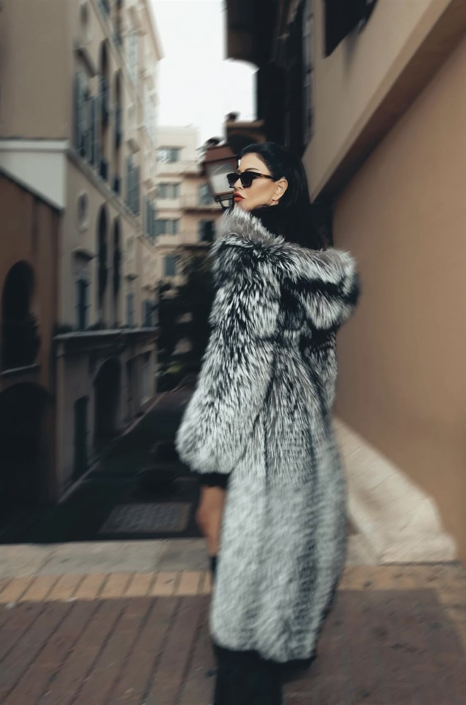 - معطف الفرو الطويل بالرمادي والأسود: أضاف طابعًا دراميًا فاخرًا، مهيمنًا على الإطلالة ومواكبًا لصيحات الموضة العالمية.
