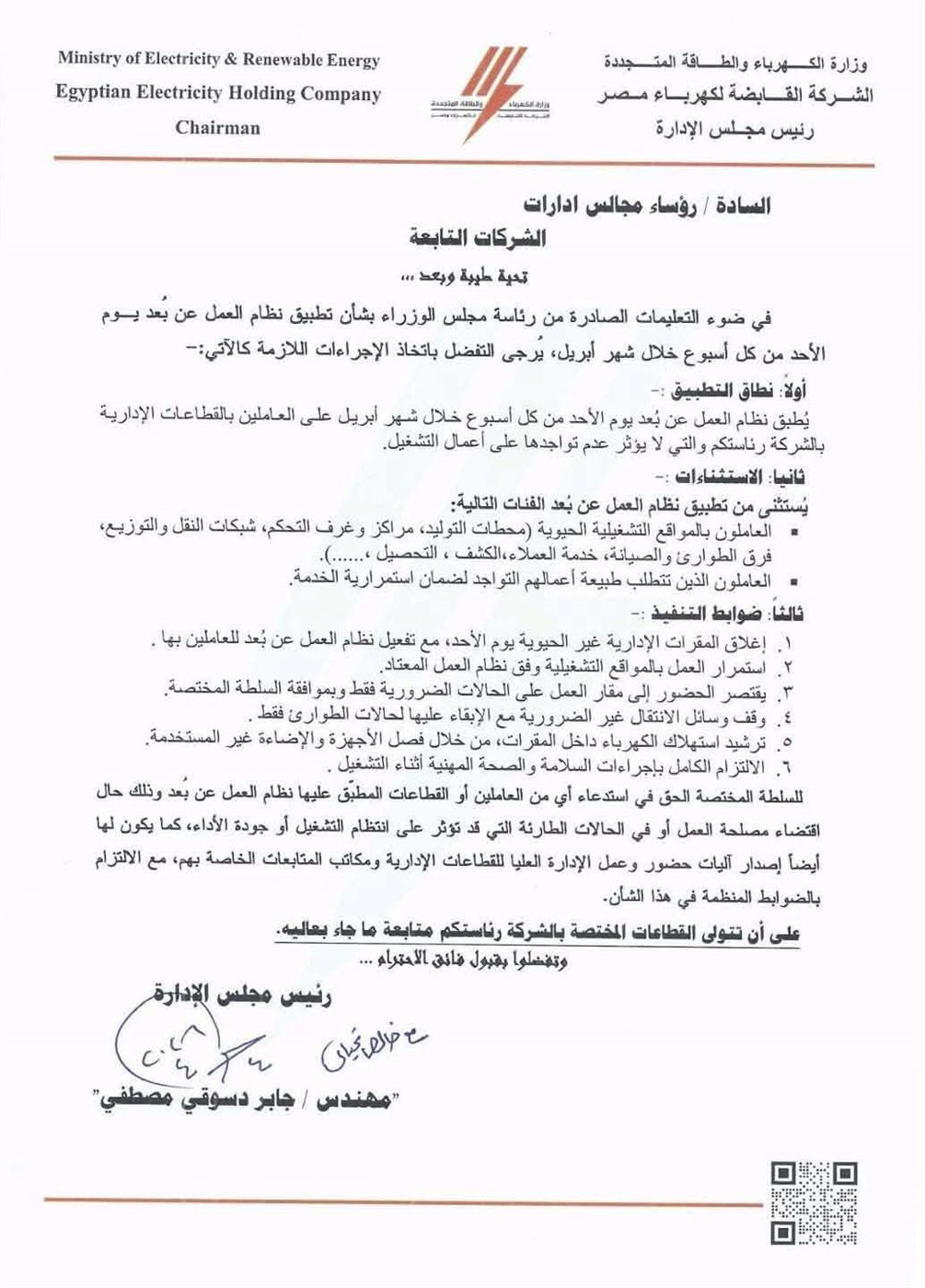 وتضمنت القرارات الجديد لـ الشركة القابضة لكهرباء مصر لتطبيق العمل عن بعد يوم الأحد من كل أسبوع خلال شهر أبريل على العاملين بالقطاعات الإدارية بشركات التوزيع بما لا يؤثر عدم تواجدهم على أعمال التشغيل.