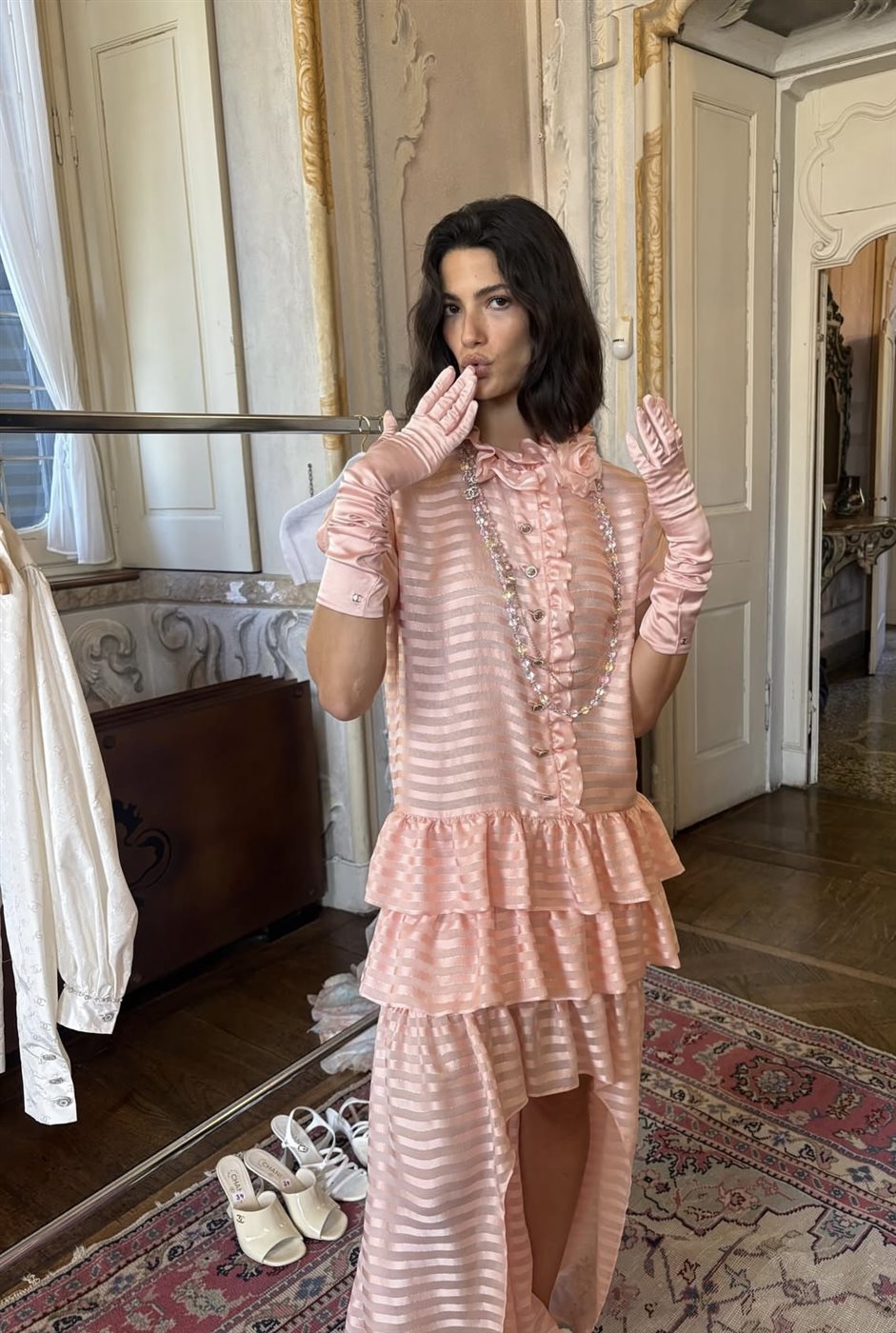 في المشهد الثاني، نقلتنا الصور إلى أجواء داخلية كلاسيكية مستوحاة من الطابع الباريسي، حيث ارتدت تارا عماد فستاناً وردياً أنثوياً راقياً مع كشكشات ناعمة وقماش شفاف متعدد الطبقات، أكملته قفازات طويلة وإكسسوارات بسيطة.