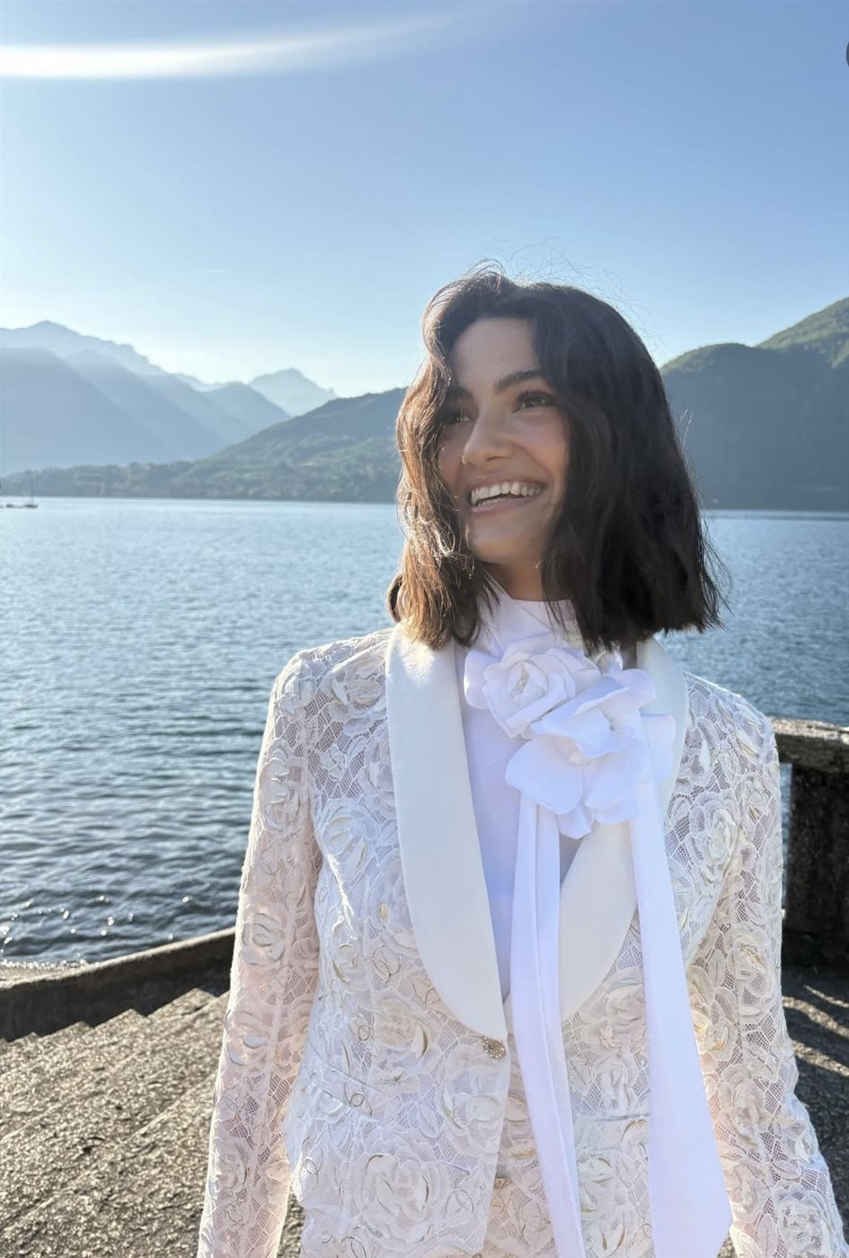 في هذه الإطلالة، ظهرت تارا عماد وسط مناظر طبيعية ساحرة، مع بحيرة وجبال تعكس الهدوء والصفاء. ارتدت فستاناً أبيض من الدانتيل، مزين بتفاصيل ناعمة ووشاح طويل مع وردة كبيرة عند العنق، ما أضفى طابعاً شاعرياً وحالمًا.
