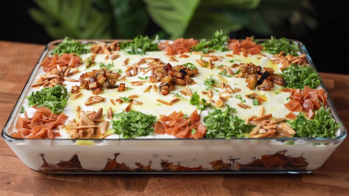 في طبق التقديم، ضعي طبقة من الخبز المقلي، ثم الباذنجان والحمص، واسكبي صوص اللبن فوقها.