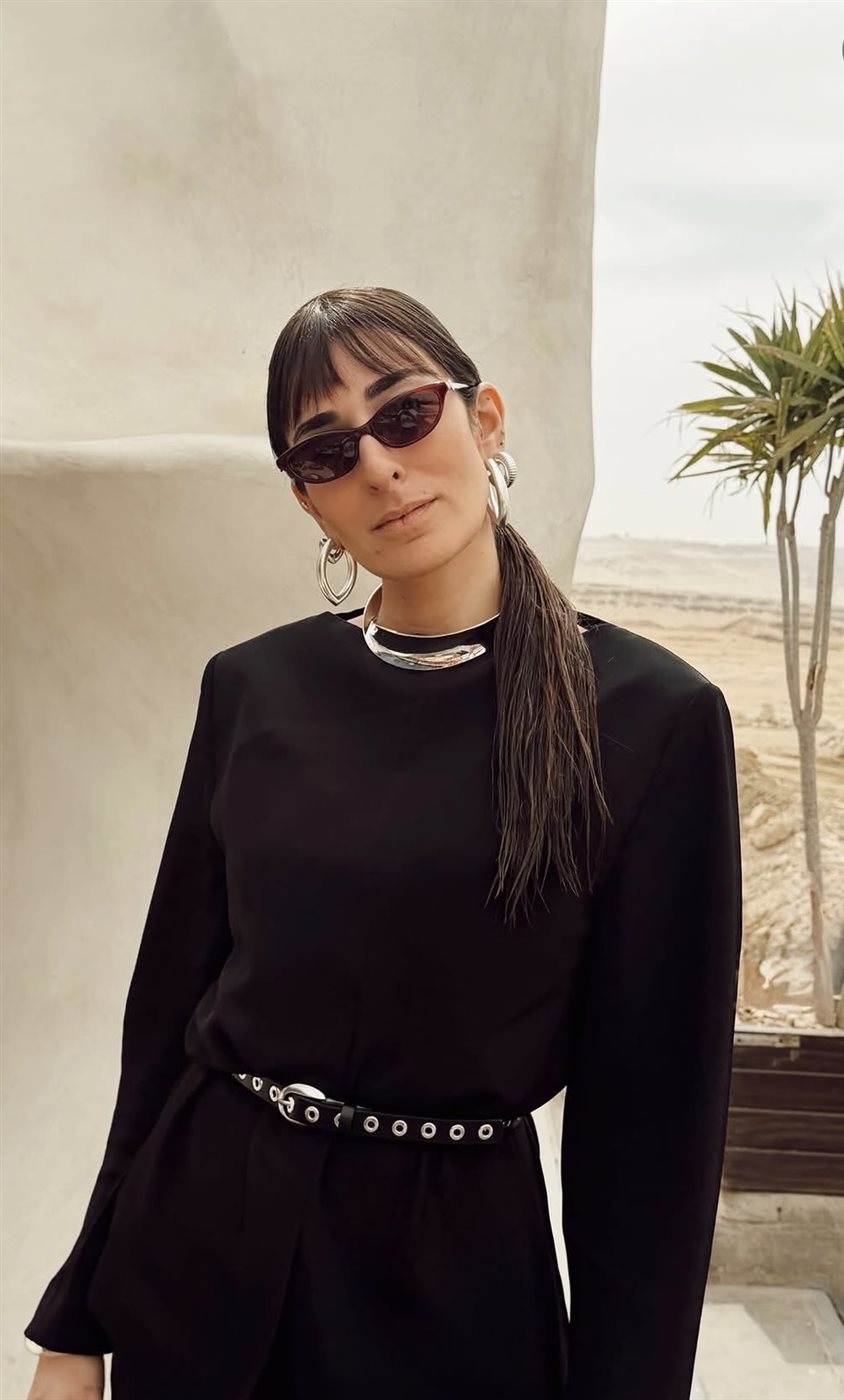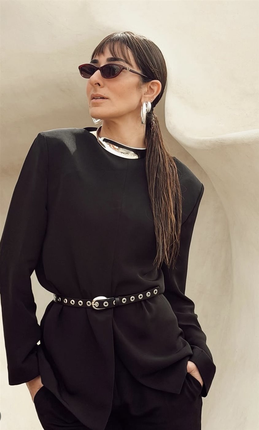 ومن ناحية التفاصيل، ظهرت أمينة خليل في الإطلالة الأولى مرتدية طقماً أسود بتصميم انسيابي، تميز بخطوط نظيفة وقصّة دقيقة، مع حزام عند الخصر أضاف لمسة عصرية أبرزت القوام بشكل أنيق. وقد أكملت إطلالتها بنظارة شمسية صغيرة بطابع كلاسيكي، إلى جانب مجوهرات فضية بتصميم عصري، بينما جاءت تسريحة الشعر بسيطة ومشدودة للخلف، ما ساهم في تسليط الضوء على ملامح الوجه والإكسسوارات.