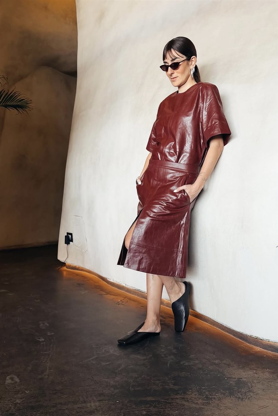 وفي إطلالة أخرى، اختارت فستاناً جلدياً باللون العنابي، جمع بين الجرأة في الخامة والرقي في التصميم، حيث اتسم بقصة مريحة وأنيقة في آن واحد، ليعكس قدرة أمينة على التنقل بسلاسة بين الأساليب المختلفة دون فقدان هويتها الخاصة.