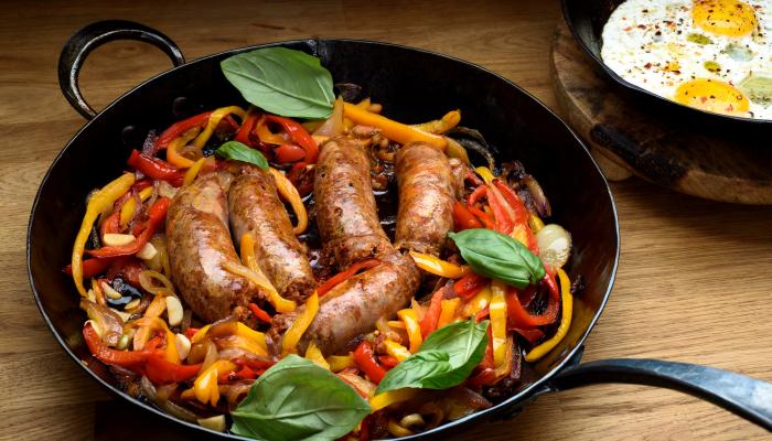 أضيفي السجق مرة أخرى إلى المقلاة، وقلّبي برفق مع الخضار والصلصة لمدة دقيقتين حتى تمتزج النكهات.