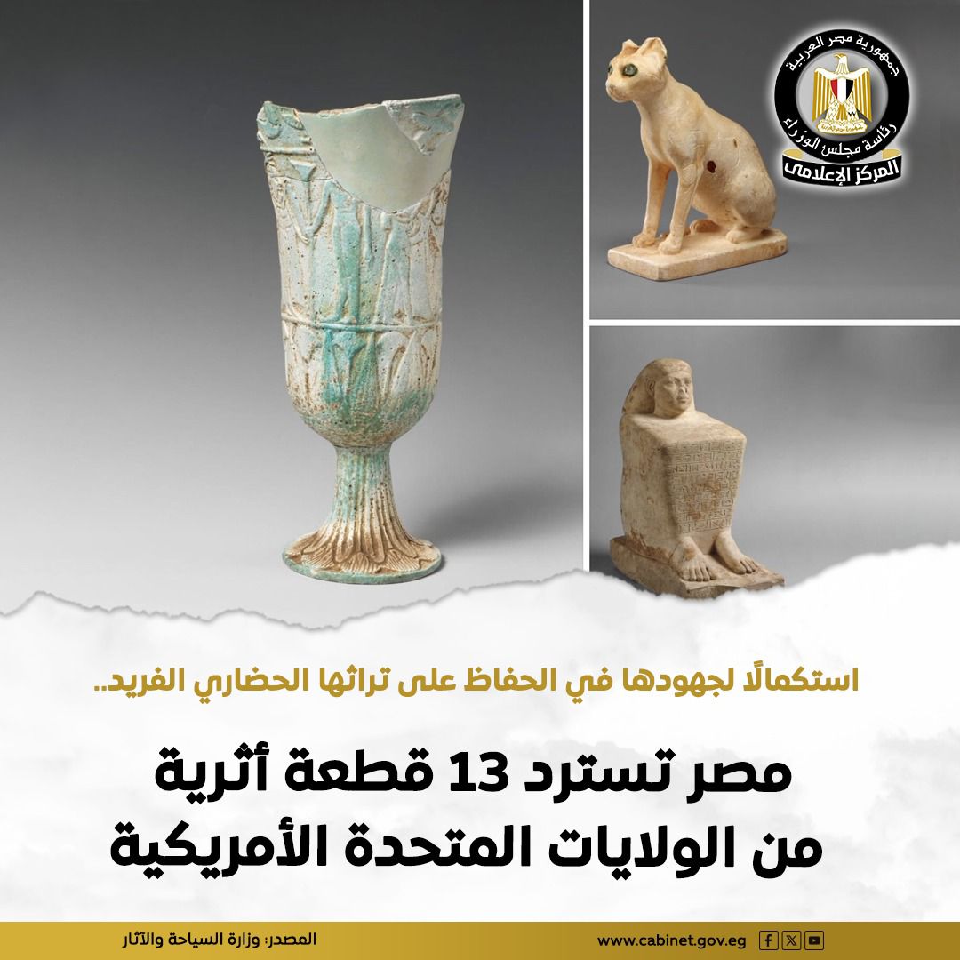 مصر تسترد 13 قطعة أثرية نادرة من الولايات المتحدة تعود لعصور مختلفة