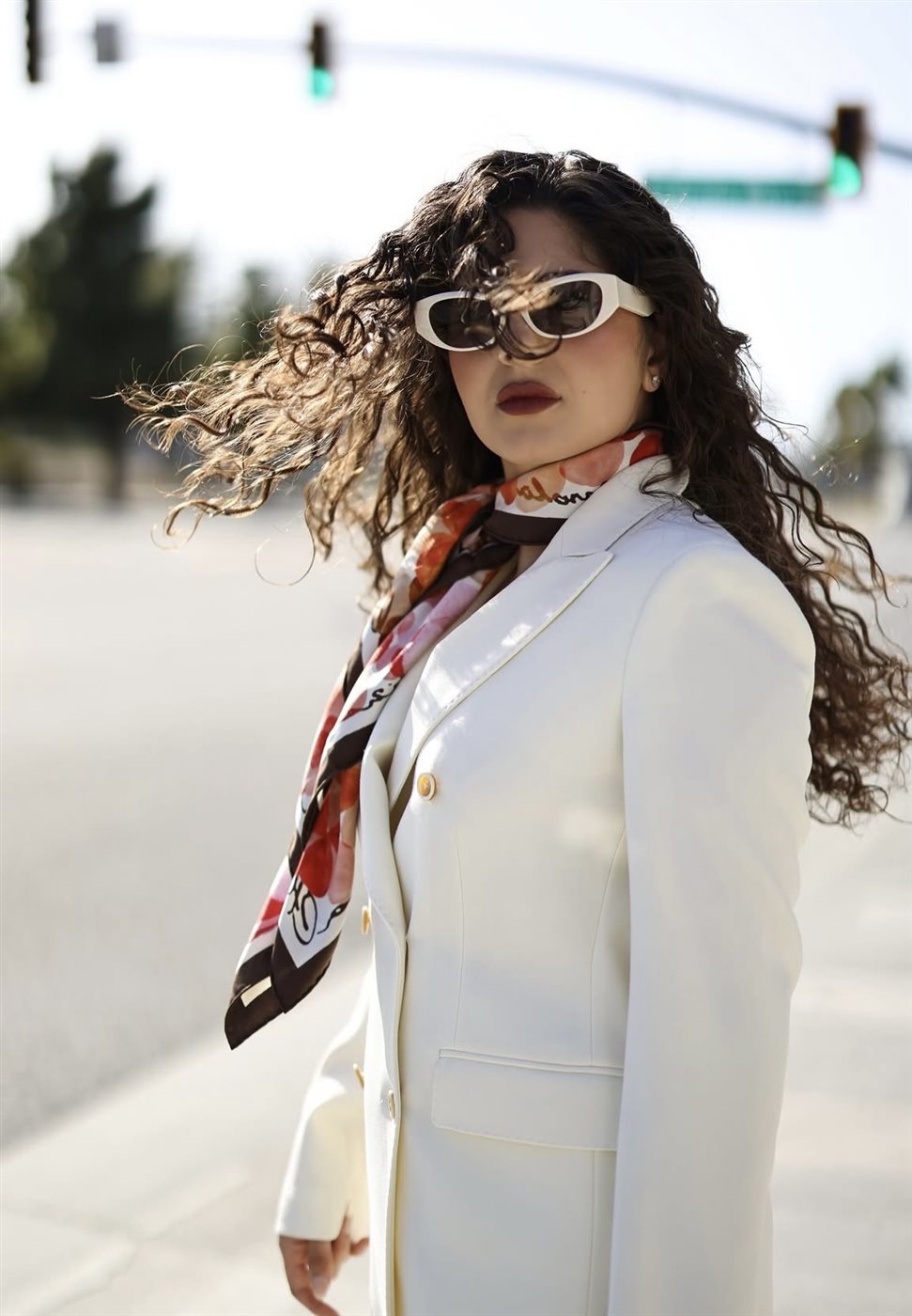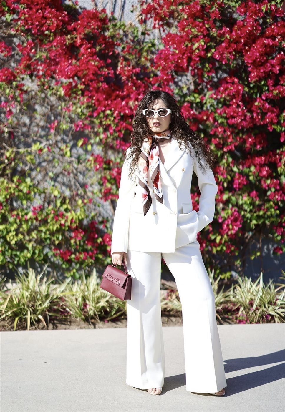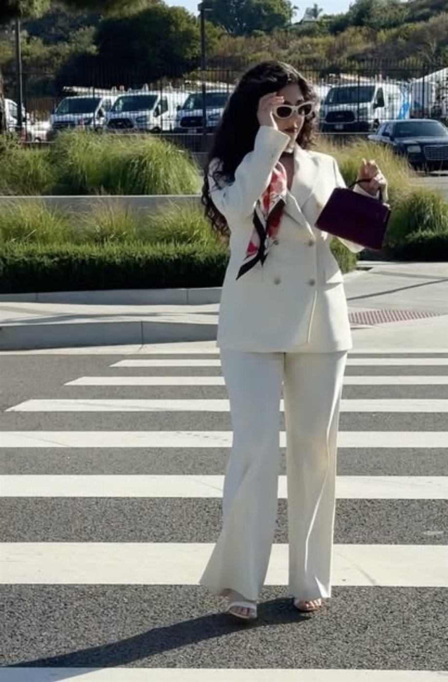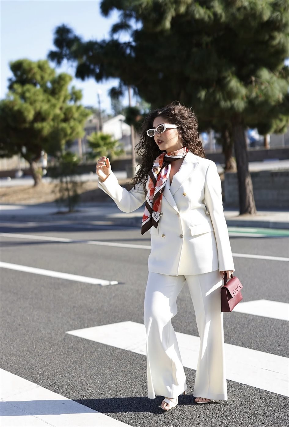 ولإضافة لمسة حيوية، نسّقت إطلالتها مع وشاح حريري متعدد الألوان التفّ حول عنقها، ما كسر حيادية اللون الأبيض ومنح اللوك طابعًا أكثر حيوية. كما اعتمدت نظارة شمسية بتصميم جريء عززت من الطابع العصري، لتظهر بإطلالة أقرب إلى أسلوب “الشوارع الأنيق” الذي يجمع بين العملية والفخامة.