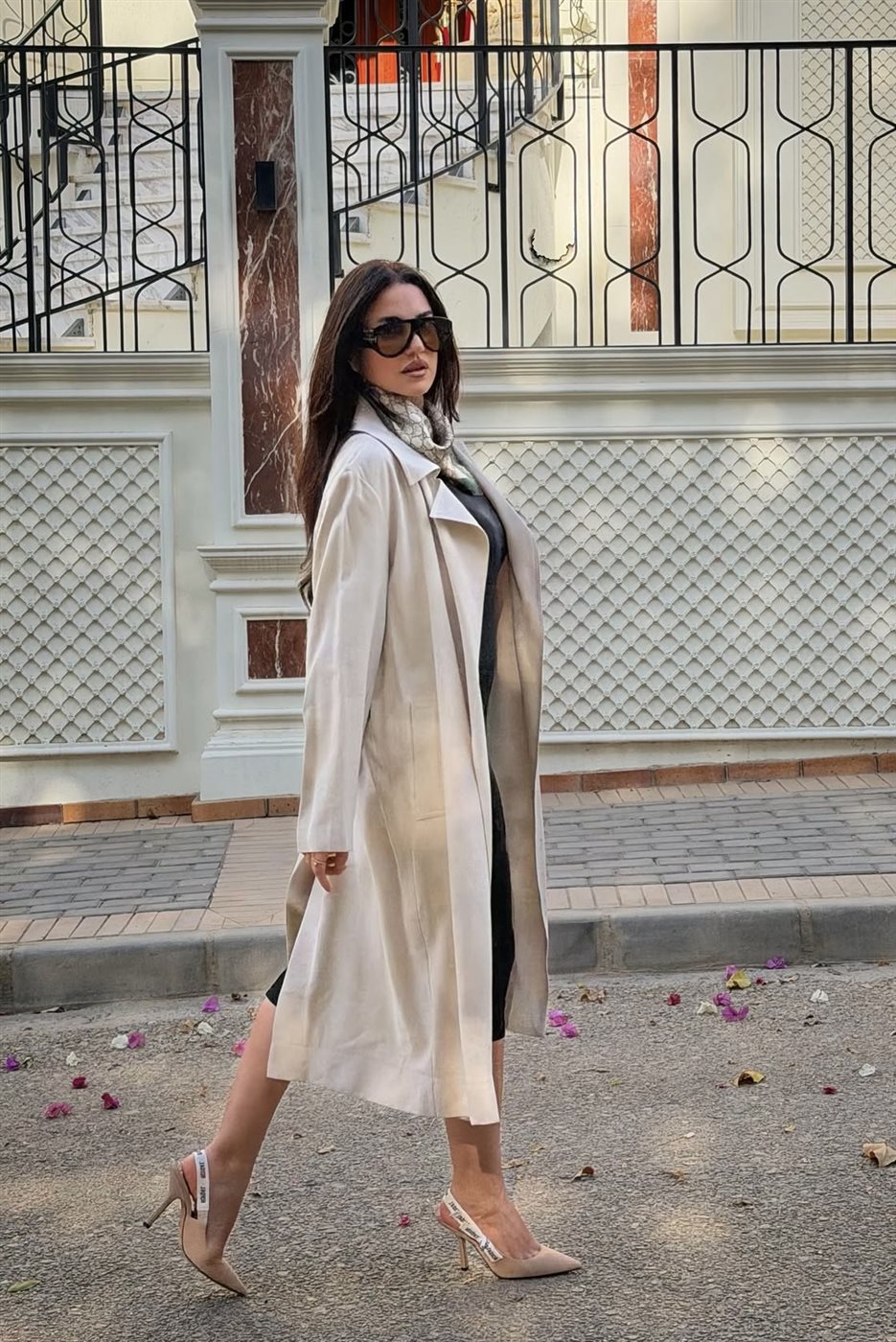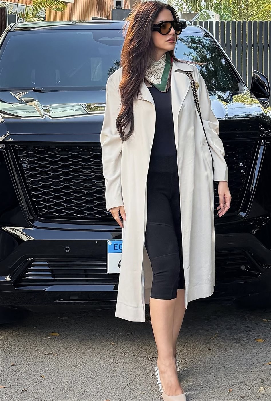 ومن ناحية أخرى، اعتمدت درة زروق في إحدى إطلالاتها أسلوب “Smart Casual”، الذي يوازن بين العملية والرقي. فقد ارتدت فستانًا أسود ضيقًا بطول متوسط، ونسقته مع معطف طويل باللون البيج، في اختيار يعكس توجهات الموضة الحديثة نحو الألوان الهادئة والتصاميم البسيطة. كما أضافت حذاءً بكعب عالٍ بلون nude، ما منح الإطلالة انسيابية لافتة، إلى جانب نظارة شمسية كبيرة أضفت طابعًا عصريًا جريئًا.