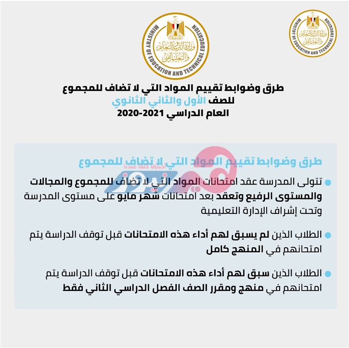 وأكدت وزارة التربية والتعليم، أنها تعقد امتحان طلاب الصفين الأول والثاني الثانوي، بنظام امتحانين مجمعين في نهاية شهر أبريل ونهاية شهر مايو بالمدرسة، داخل لجان مؤمنة ومراقبة.