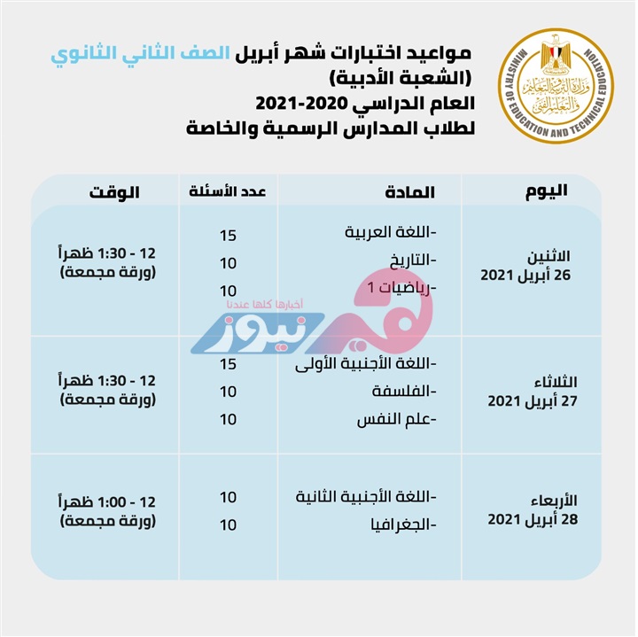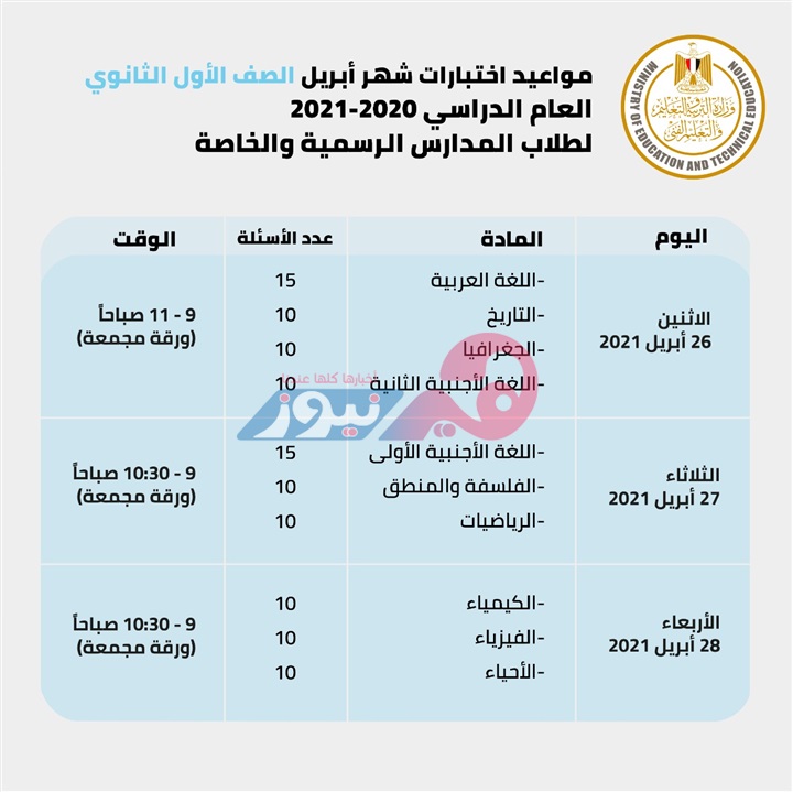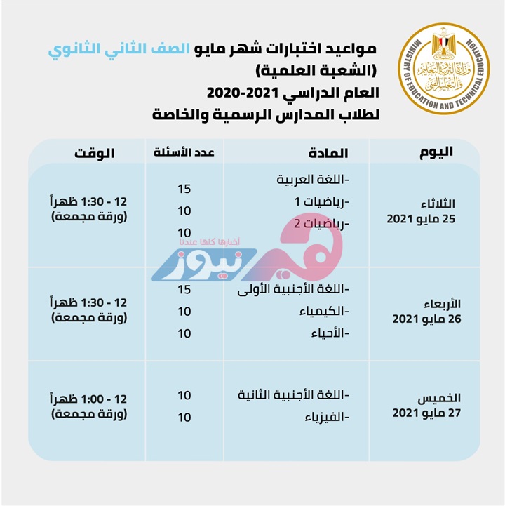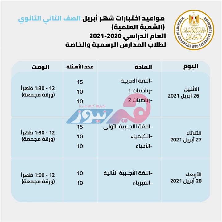 - وتكون مواعيد الامتحانات في شهور أبريل ومايو حسب الجداول التالية: