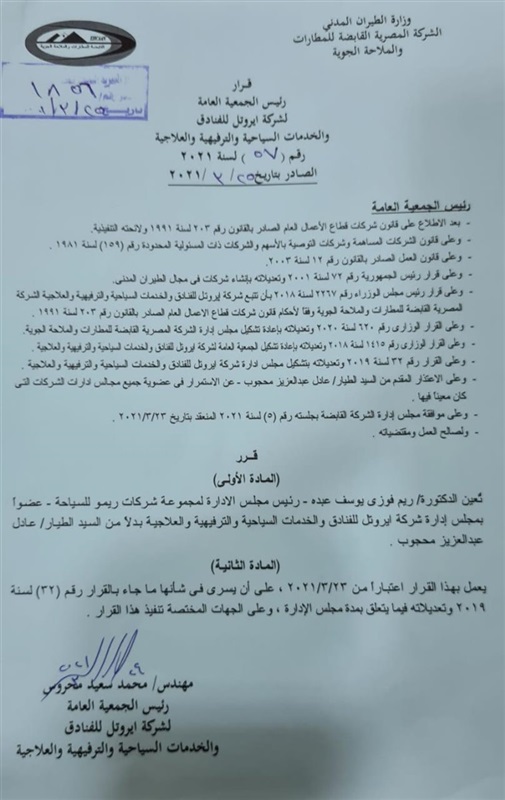 وقد جاء قرار رئيس الجمعية العمومية لشركة ايروتيل للفنادق والخدمات السياحية والترفيهية والعلاجية، الذى حمل رقم57 لسنة 2021 وتنفيذا لقرار الجمعية العمومية لهذا الاختيار.وكان الطيار عادل عبد العزيز محجوب، قد تقدم باعتذار على الاستمرار في عضوية جميع مجالس إدارات الشركات التي كان معينا بها، وكذلك موافقة مجلس إدارة الشركة القابضة للمطارات والملاحة الجوية بجلسه رقم 5 لسنة 2021 المنعقد يوم 23 مارس 2021.