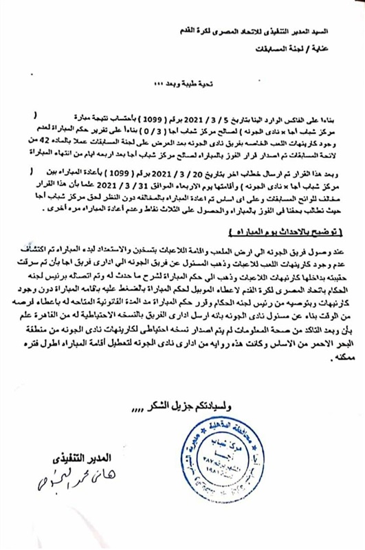 أرسل مسؤولو مركز شباب أجا شكوى رسمية إلى اتحاد الكرة اعتراضًا على قرار الجبلاية بإعادة لقاء فريق السيدات لكرة القدم والجونة ضمن لقاءات الدوري الممتاز للكرة النسائية.