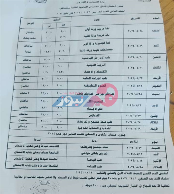 تنطلق السبت المقبل الموافق 18 مايو، أولى امتحانات آخر العام الدراسي 2024/ 2023 التحريرية للصفين الأول والثاني بالمدرسة الثانوية الفنية للتمريض في محافظة جنوب سيناء، وتنتهي يوم الثلاثاء الموافق 28 مايو بالنسبة إلى الصف الأول ، و29 مايو بالنسبة للصف الثاني.