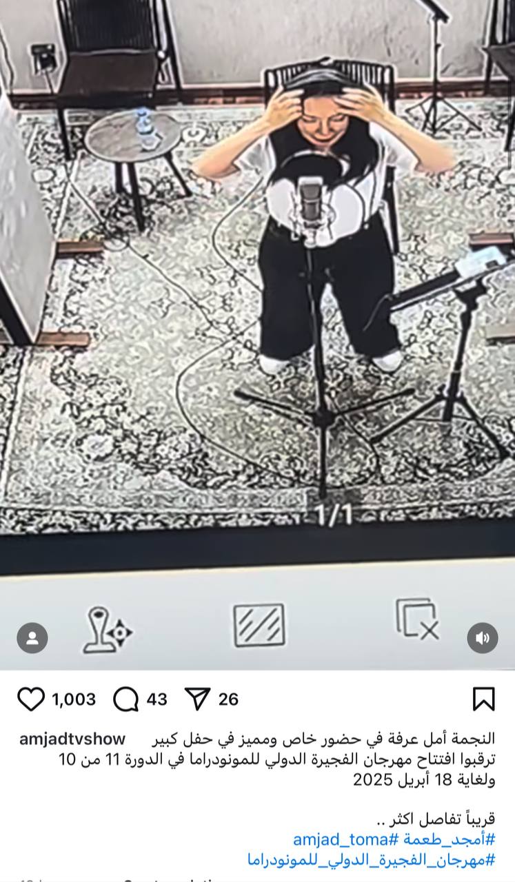 كما نشرت أمل عرفة صورة ومقطع فيديو عبر حساباتها الرسمية على مواقع التواصل الاجتماعي من داخل الاستوديو، حيث ظهرت برفقة الفنانين أمجد طعمة، وحازم جبر، والموسيقي فادي مرديني، أثناء تسجيلها لأغنية خاصة بالمهرجان، وأرفقت الفيديو بكلمة واحدة: "قريبًا".