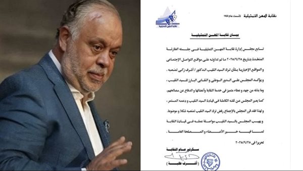 عقد مجلس نقابة المهن التمثيلية، والذي يرأسه أشرف زكي، اجتماعًا طارئًا يوم 25 سبتمبر 2025 لمناقشة ما تم تداوله عبر وسائل التواصل الاجتماعي وبعض المواقع الإخبارية بشأن قرار الدكتور أشرف زكي، نقيب الممثلين، تقديم استقالته من منصبه.