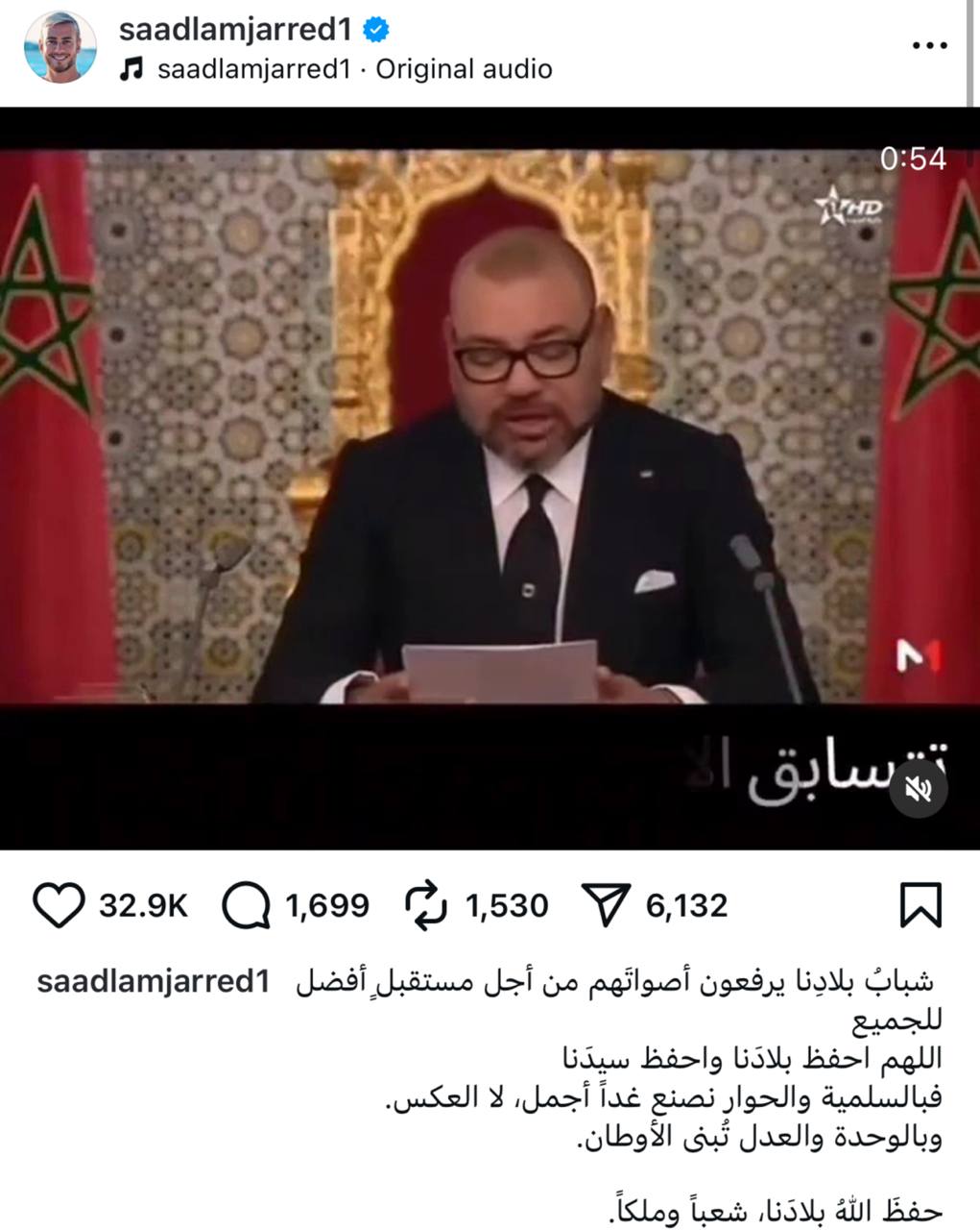 وكتب سعد لمجرد: “شبابُ بلادِنا يرفعون أصواتَهم من أجل مستقبلٍ أفضل للجميع. اللهم احفظ بلادَنا واحفظ سيدَنا. فبالسلمية والحوار نصنع غداً أجمل، لا العكس. وبالوحدة والعدل تُبنى الأوطان. حفظ الله بلادَنا، شعباً وملكاً”.