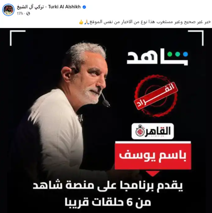 وفي سياق متصل، حسم المستشار تركي آل الشيخ، رئيس الهيئة العامة للترفيه بالسعودية، الجدل حول ما تردد عن تحضير باسم يوسف لبرنامج جديد عبر منصة “شاهد”. حيث نشر عبر صفحته الرسمية على فيسبوك صورة من خبر متداول، وأرفقها بتعليق مقتضب قال فيه: “خبر غير صحيح”.