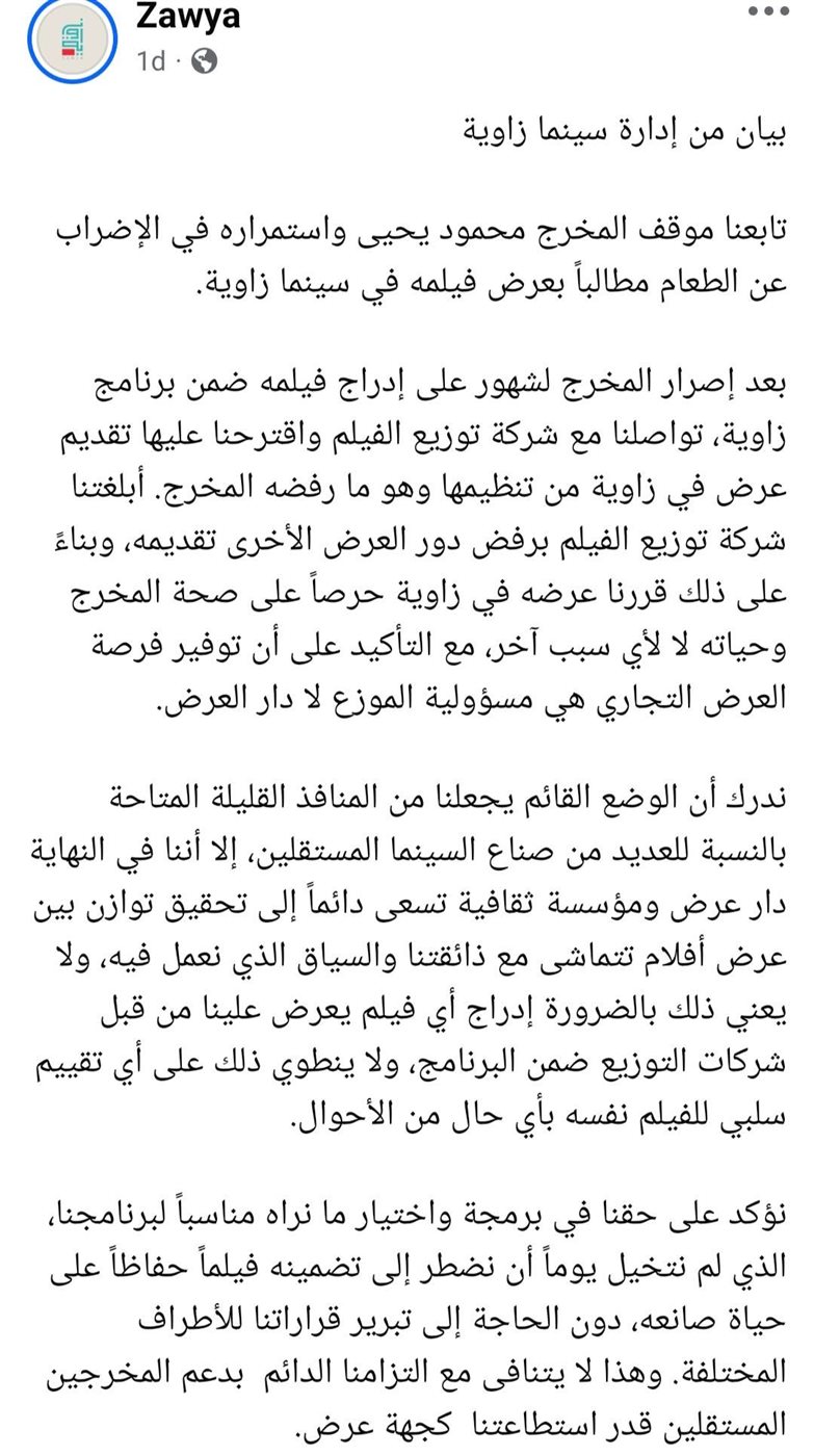 فيما كشف المخرج عن تعرضه لاعتداء خلال اعتصامه. وأكد في الوقت ذاته أنه لا يدعو إلى مقاطعة سينما زاوية، بل يطالب فقط بإنصاف فيلمه وضمان وصوله إلى جمهوره.