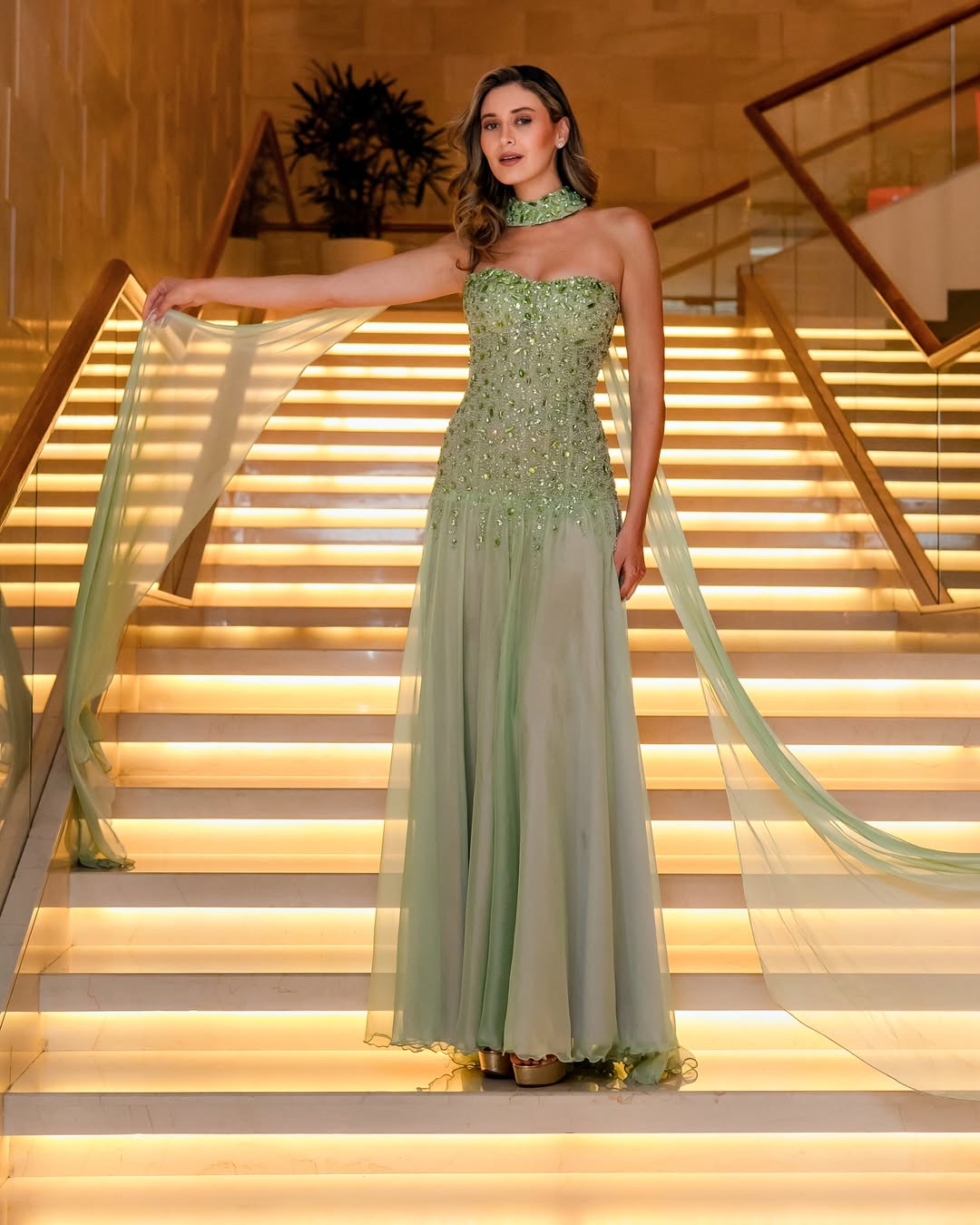 أطلت بفستان أخضر لامع من تصميم بيتر عبد الكريم، مرصّع بالأحجار البرّاقة مع تفاصيل لافتة على منطقة الصدر وعقد أنيق حول العنق، فيما انساب القماش الحريري خلفها ليمنح الإطلالة بعدًا دراميًا راقيًا.