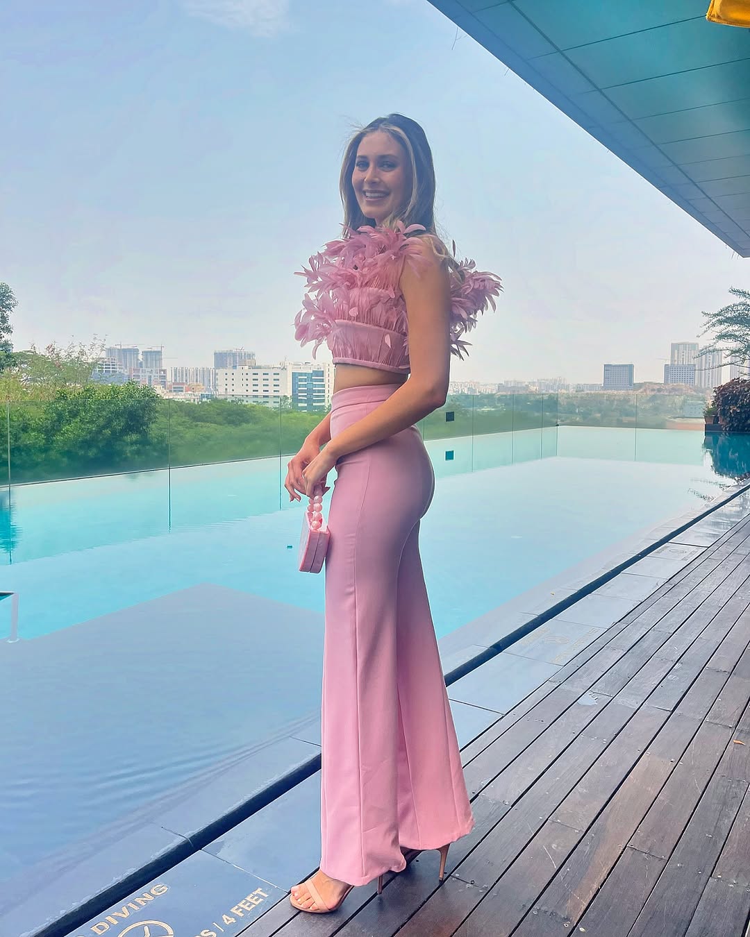 ظهرت ببدلة وردية جريئة تتألف من سروال واسع وتوب بلا أكمام مزدان بالريش، في إطلالة عكست صورة المرأة العربية العصرية الواثقة بنفسها.