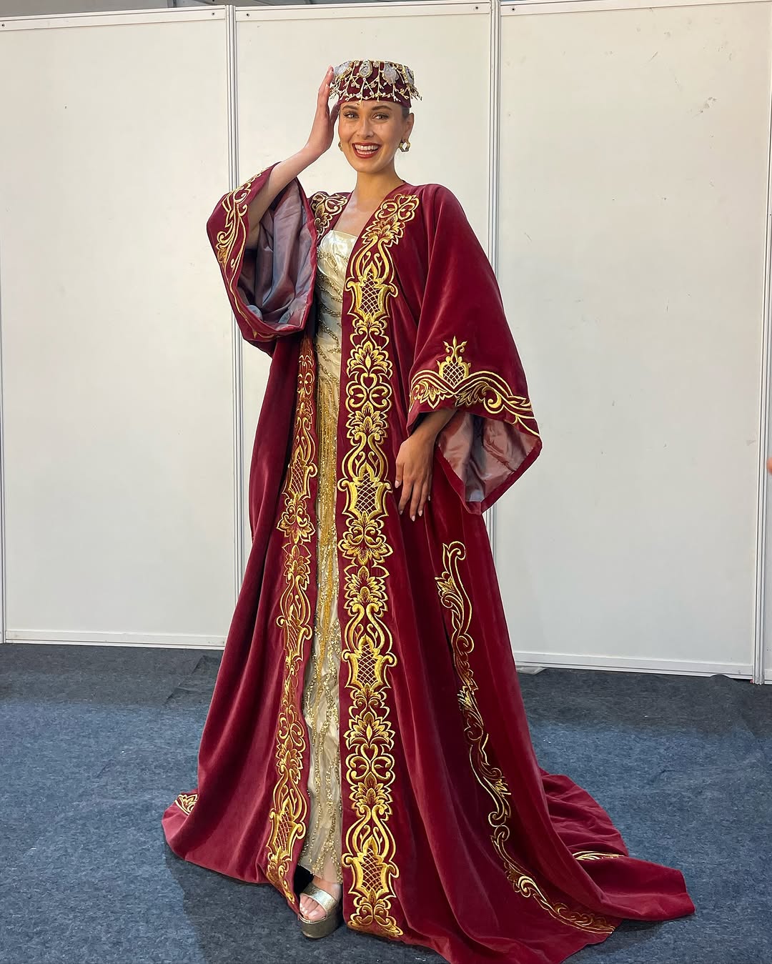 في فقرة الأزياء الوطنية في مسابقة ملكة جمال العالم، أبهرت الحضور بعباءة أرجوانية حمراء مفتوحةمطرزة بخيوط ذهبية من تصميم Maison Bou Tanous، ارتدتها فوق فستان ذهبي مرصّع بالخرز والترتر، وتوّجت الإطلالة بتاج تقليدي من القماش نفسه، في تجسيد راقٍ للهوية اللبنانية.