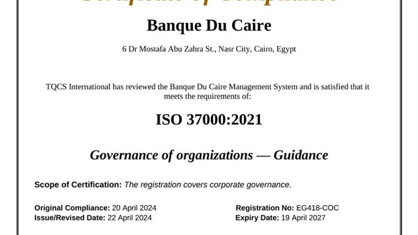 في تأكيد جديد على ريادته في تطبيق أعلى معايير الحوكمة المؤسسية، أعلن بنك القاهرة عن تجديد اعتماد شهادة الأيزو الدولية ISO 37000 في مجال الحوكمة المؤسسية للعام الثاني على التوالي، وذلك تتويجاً لجهوده المستمرة في مواءمة أنظمته وإجراءاته مع المعايير الدولية المعتمدة.